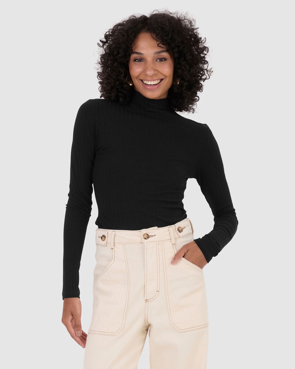 Blusa Básica Feminina Gola Alta Em Malha Canelada De Viscose