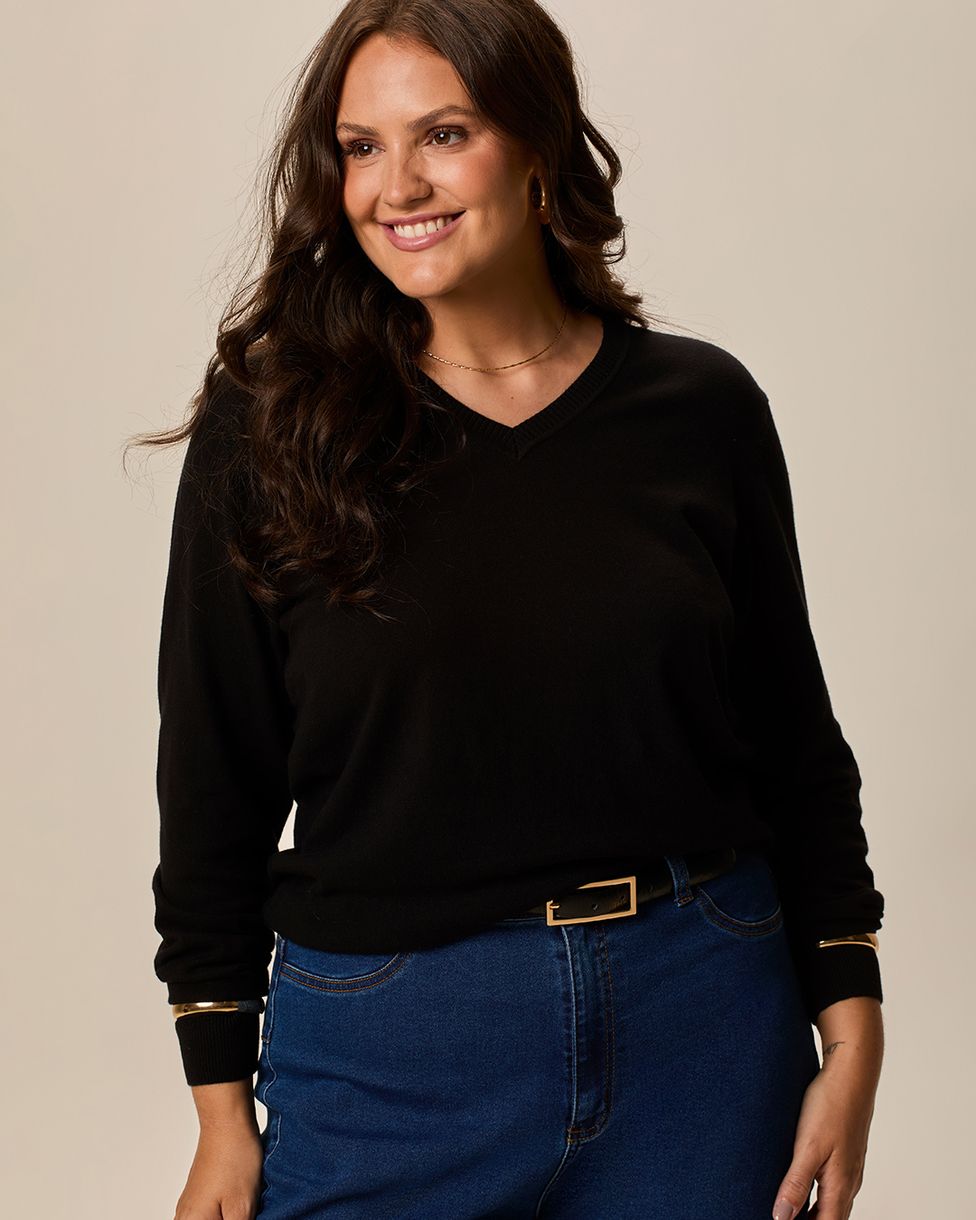 Suéter Básico Feminino Plus Size Gola V Em Tricô