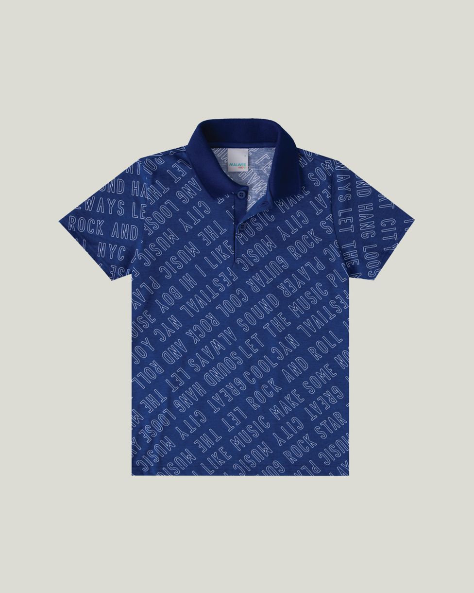 Camisa polo confeccionado em meia malha. Modelo possui gola esporte, mangas curtas e peitilho com botões. Estampa corrida com inscrições. Uma peça essencial para o guarda-roupa do seu pequeno. Invista com bermuda jeans e tênis slip on.
