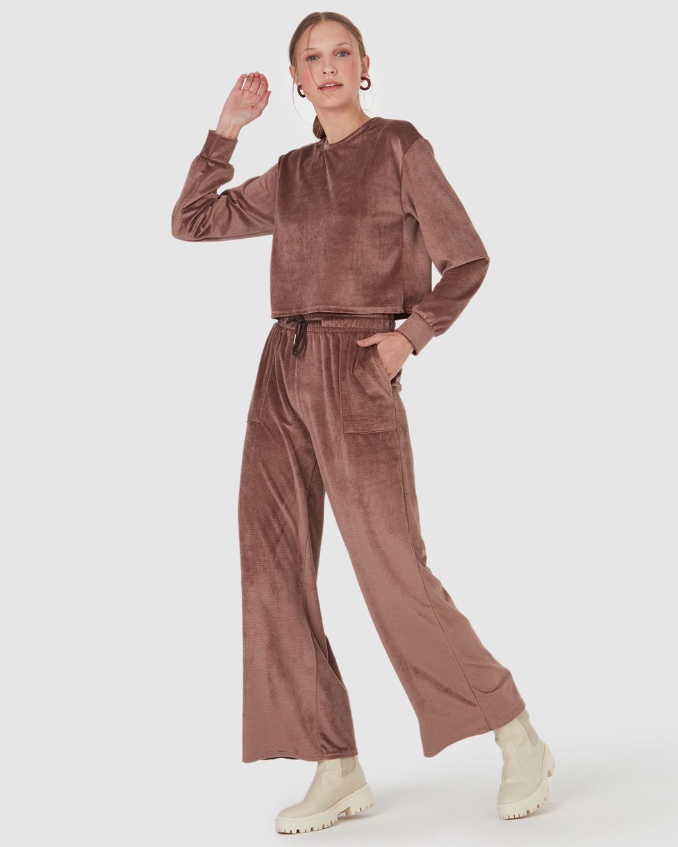 Calça feminina confeccionada em malha de veludo canelado. A calça Wide Leg, com pernas mais amplas que descem aumentando levemente até a barra, é uma peça super em alta e moderna para compor os looks da estação, ela conta com cintura alta, apresentando seu cós com elástico com cadarço frontal e bolsos frontais com pesponto aparente. Um peça curinga e estilosa, permitindo diversas combinações. Aposte com blusa ajustada de gola alta Malwee e tênis!