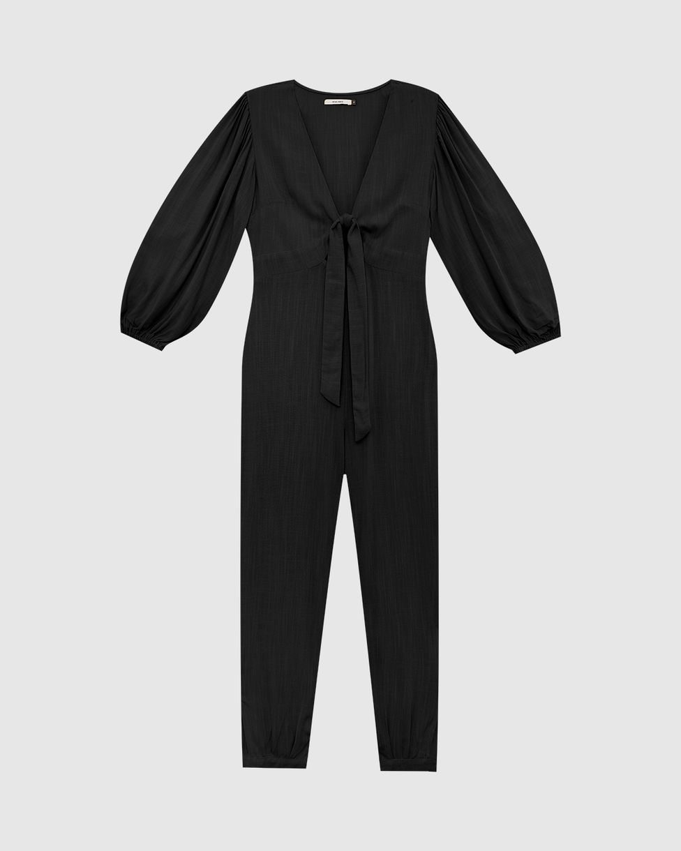 Macacão confeccionado em tecido de viscose. Um macacão elegante e leve para usar na estação, essa peça conta com decote V com detalhe de laço frontal, manga bufante com elástico e recorte na linha da cintura. Além disso, o tecido de viscose se destaca por ser maleável e de toque macio, possuindo bom caimento e frescor, sendo ideal para o uso em dias mais quentes. Aposte com sapato mocassim, para um visual clássico!