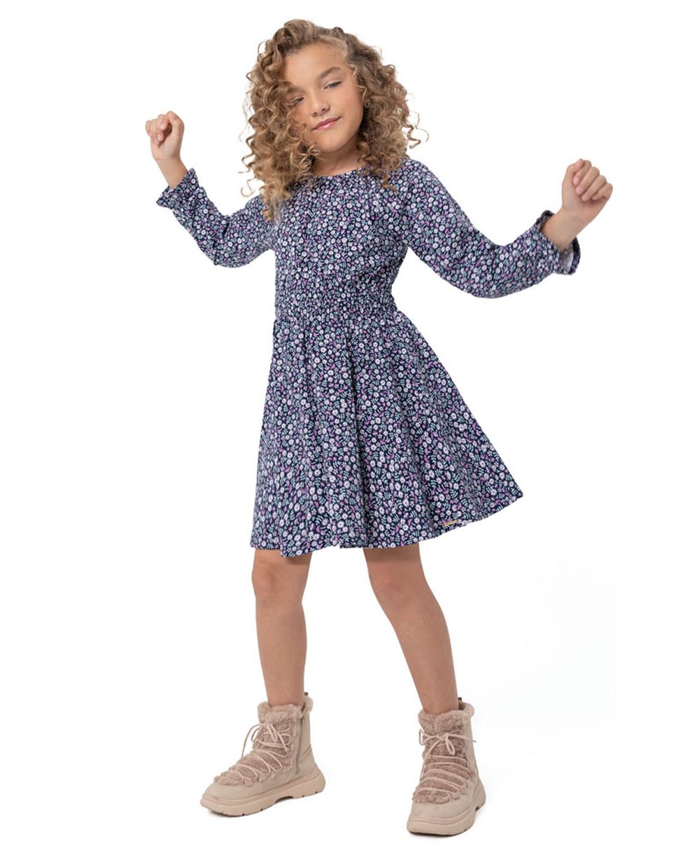 Vestido confeccionado em malha de algodão Cotton Light, um tecido super confortavel e de toque macio. Uma peça charmosa e romântica para as pequenas, o vestido com estampa floral apresenta gola redonda, mangas longas com punhos franzidos e detalhe para cintura com elastico Lastex, para maior conforto.Detalhe de plaqueta metalica costurada na barra. Complete o look com botinha de cano alto e casaco Carinhoso!