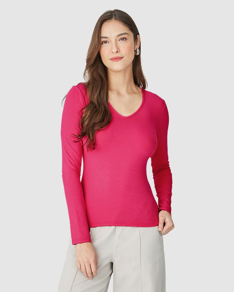Blusa Básica Feminina Gola V Manga Longa Em Viscose Stretch