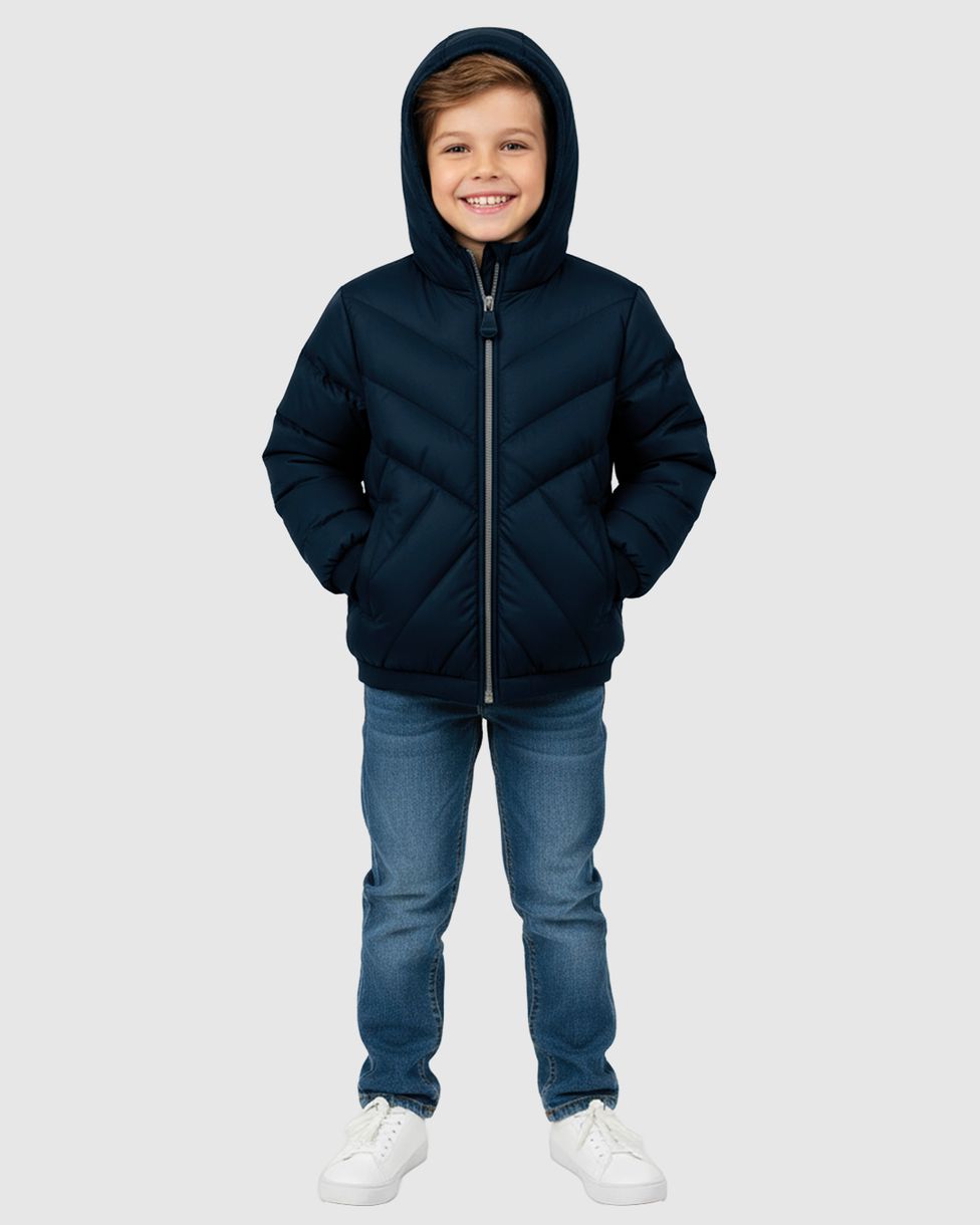 Jaqueta confeccionada em tafetá. Em modelo Puffer, essa peça possui capuz, abertura frontal por zíper, mangas longas e bolsos laterais. Unissex, é a peça perfeita para os meninos e meninas!