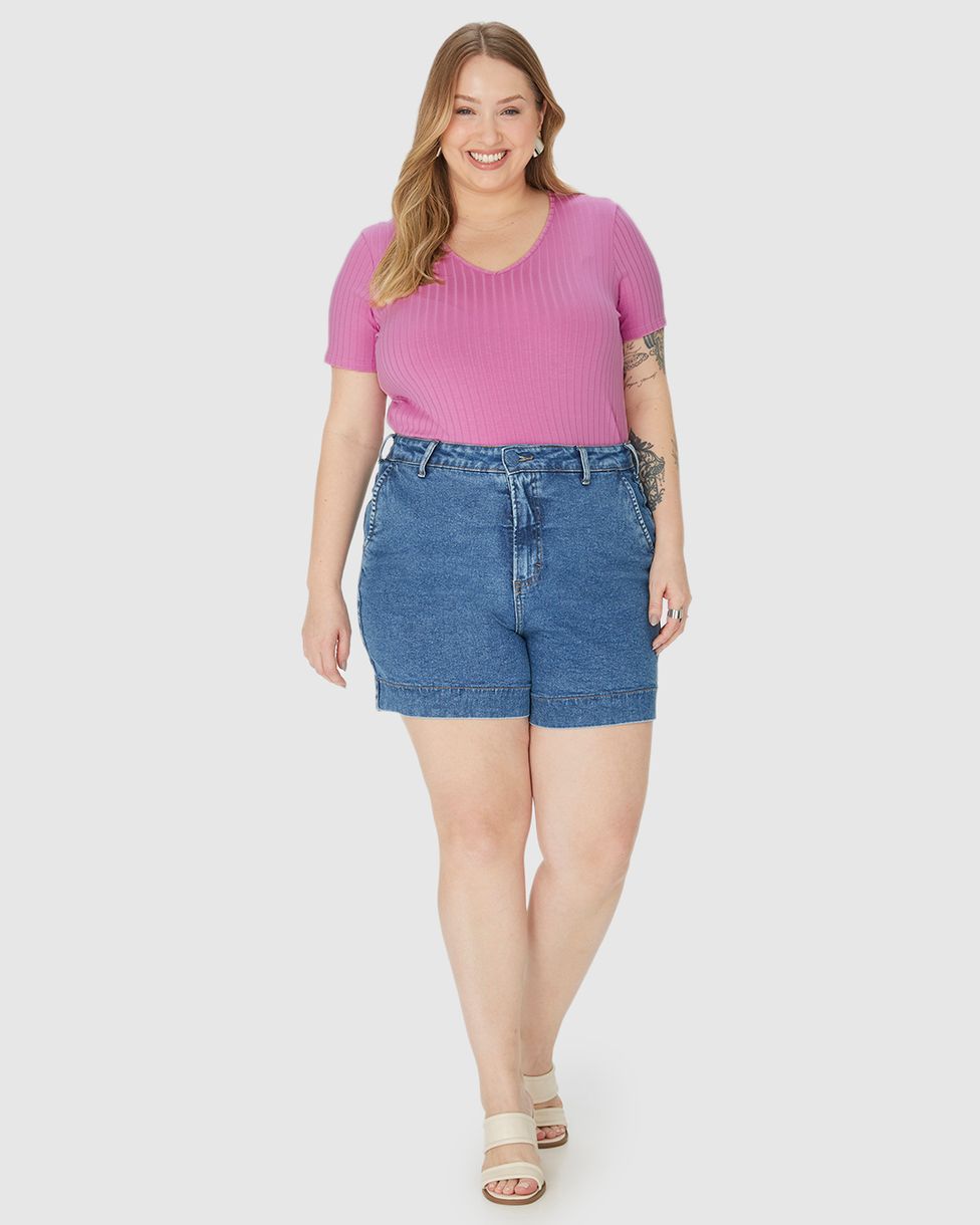 Blusa Básica Feminina Plus Size Decote V Em Canelado De Viscose
