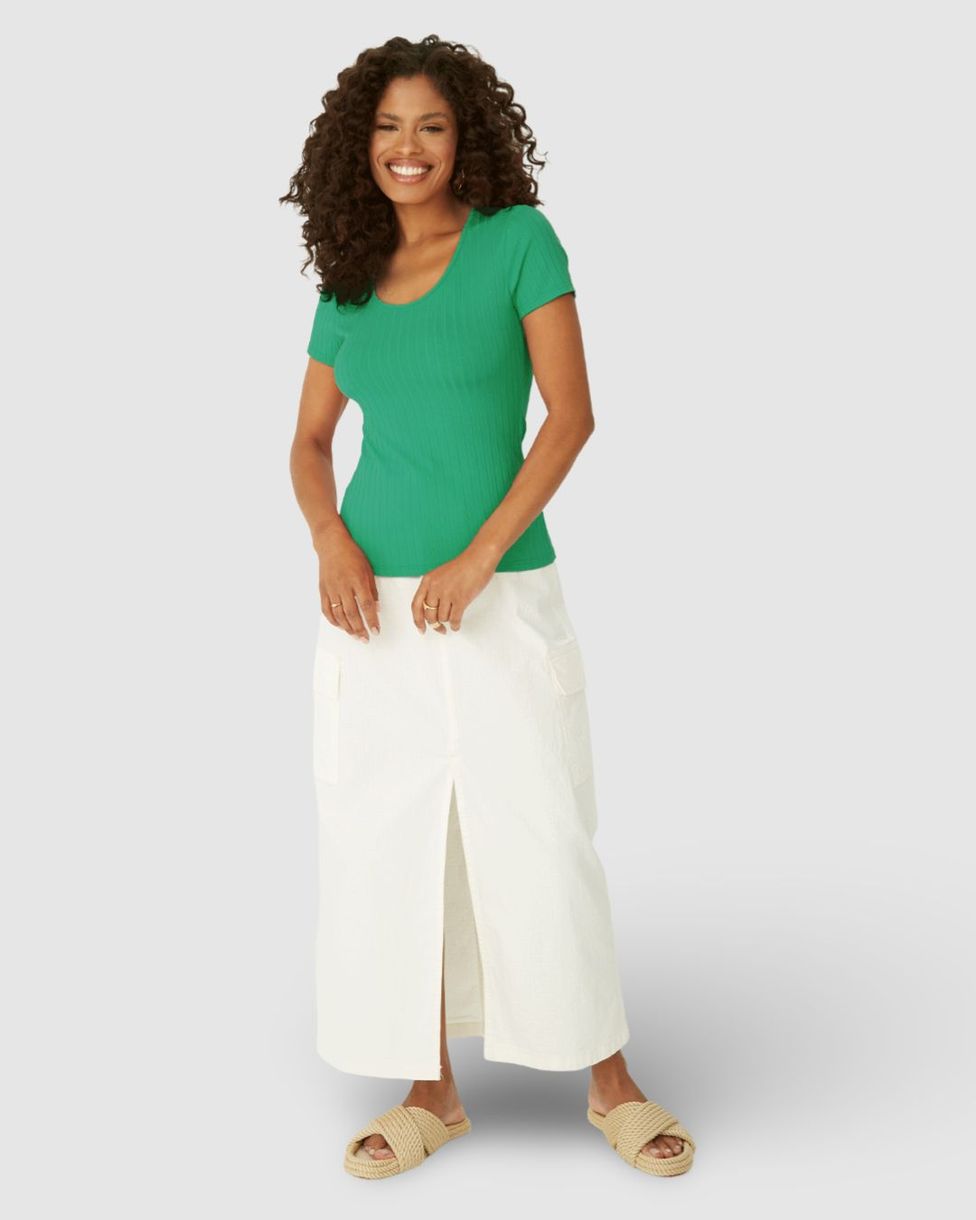 Blusa feminina feita em tecido canelado de viscose. Apresentando uma blusa com caimento mais ajustado ao corpo, é a peça perfeita para todas as ocasiões. Também apresentando decote redondo e mangas curtas, ela foi feita em malha canelada texturizada que permite frescor e conforto. Sendo uma peça atemporal e versátil, que pode ser usada tanto em combinações casuais com jeans e tênis até mais arrumadas com calça de alfaiataria e salto bloco!