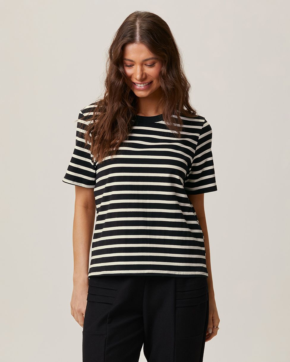 Camiseta Feminina Reta Manga Curta Em Malha Listrada