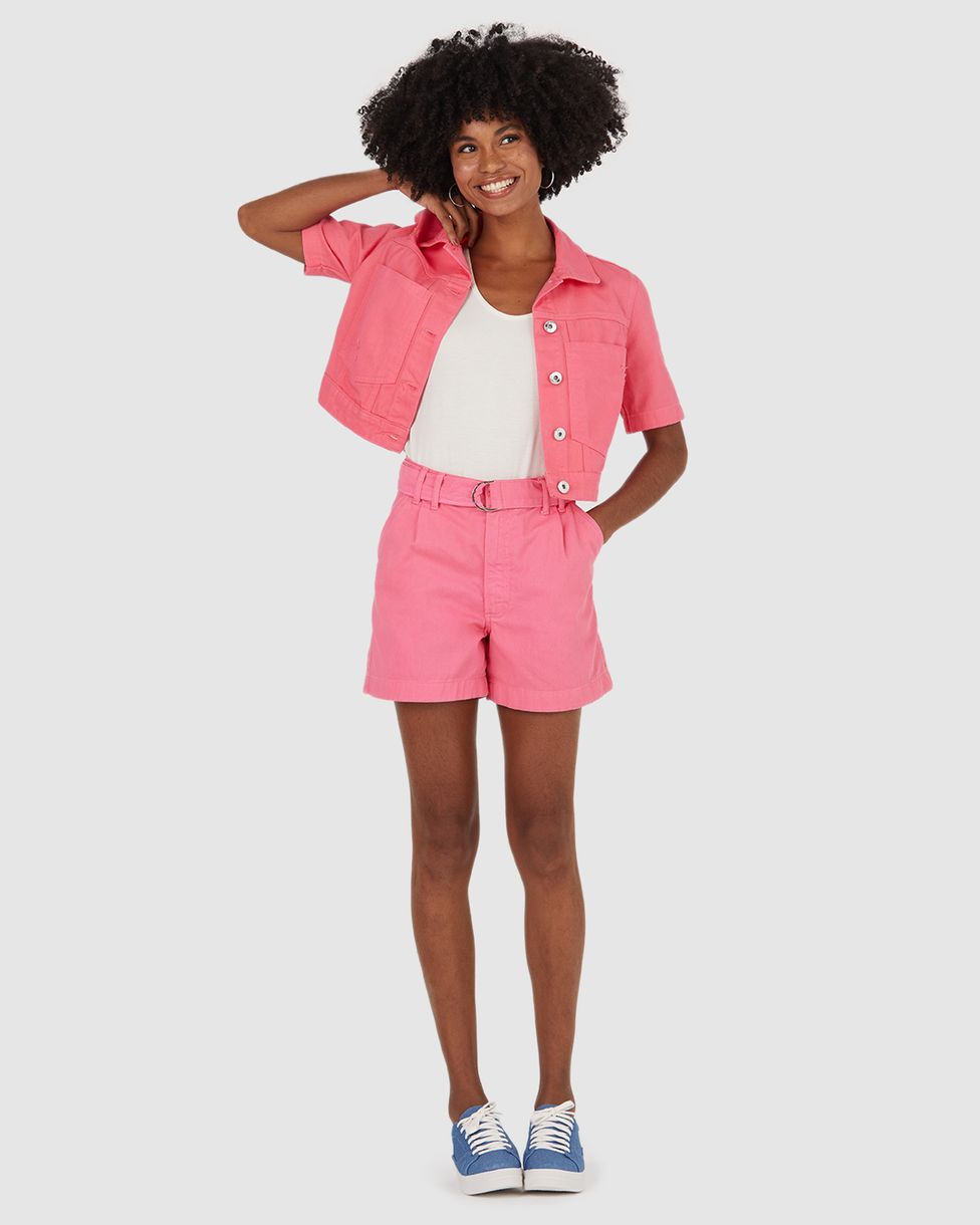 Bermuda feminina feito em sarja 100% algodão. Apresentando um modelo que se assemelha à Alfaiataria, essa bermuda de cintura alta, apresenta cós com passantes, cinto de sarja, bolsos frontais e posteriores funcionais. Com detalhe de plaqueta metálica da marca. As peças em sarja colorida da Linha Colors aumentam a possibilidade de combinações de looks. Ideal para combinar com blusa cropped Malwee e sandália de salto bloco!
