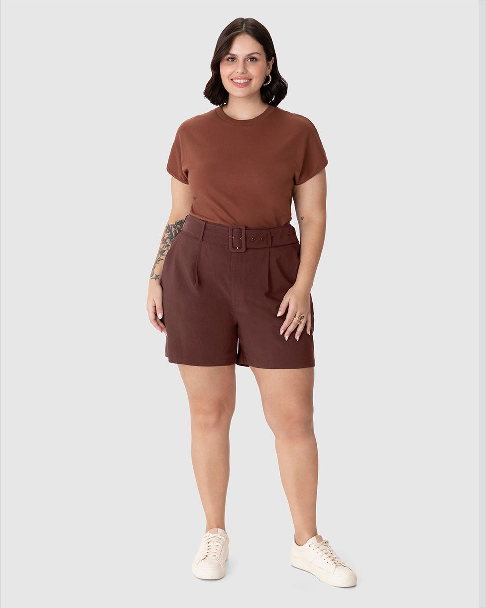 Bermuda Feminina Plus Size Com Cinto Tecido Alfaiataria Com Elastano Marrom - G3