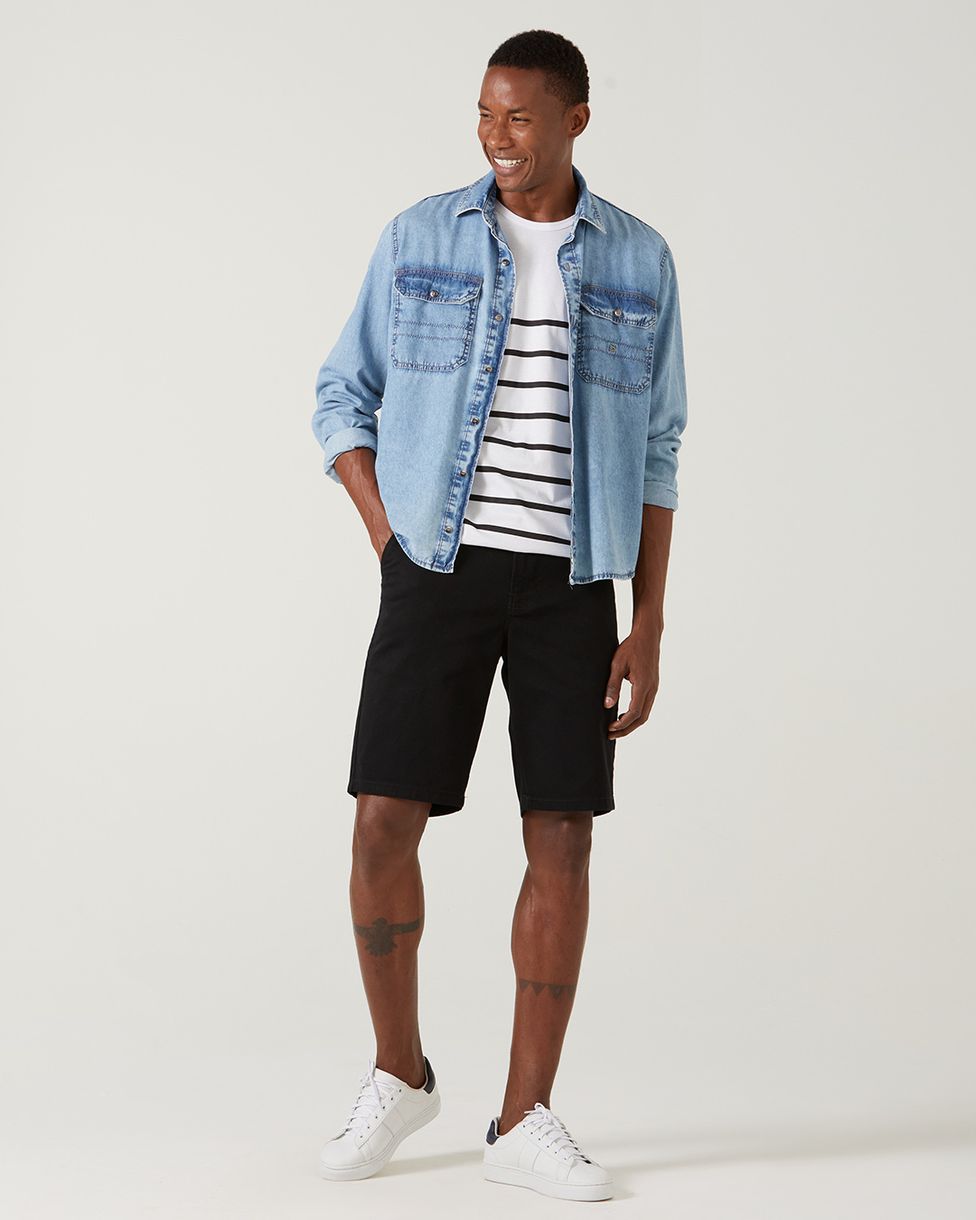 Bermuda masculina confeccionada em sarja com elastano. Apresentando uma modelagem tradicional, que acompanha as linhas do corpo com muito conforto. Essa peça conta com cintura média, cós com passantes, bolsos laterais ao estilo faca e fechamento por zíper e botão único. A peça ainda possui bolsos posteriores embutidos com botões. A sarja é um tecido plano mais encorpado que absorve o calor externo, proporcionando frescor ao vestir e o elastano traz maior conforto para a peça. Uma bermuda clássica para compor diversos looks da estação. Invista com camiseta listrada Malwee e tênis slip on, para um visual despojado!