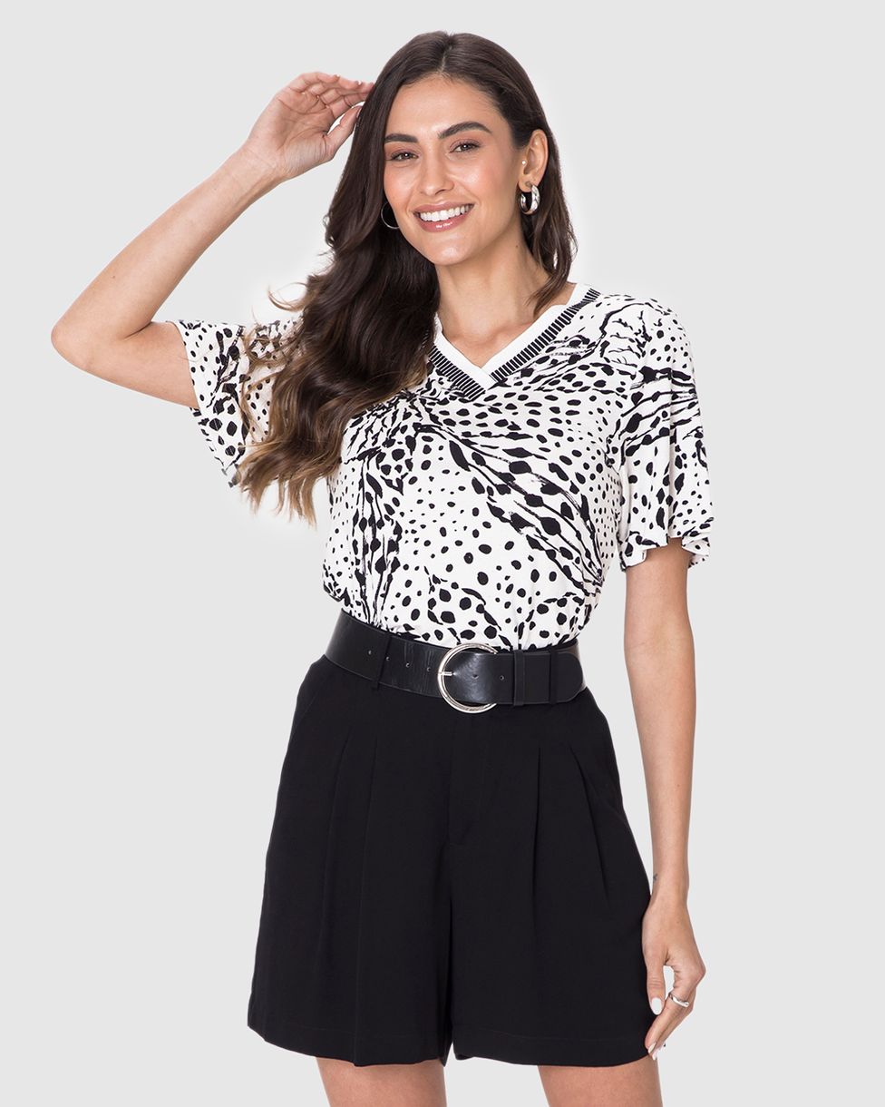 FemininoBlusas e CamisetasBlusas Manga CurtaBlusa Ampla Feminina Decote V Retilínea Em Malha Viscolinho Stretch