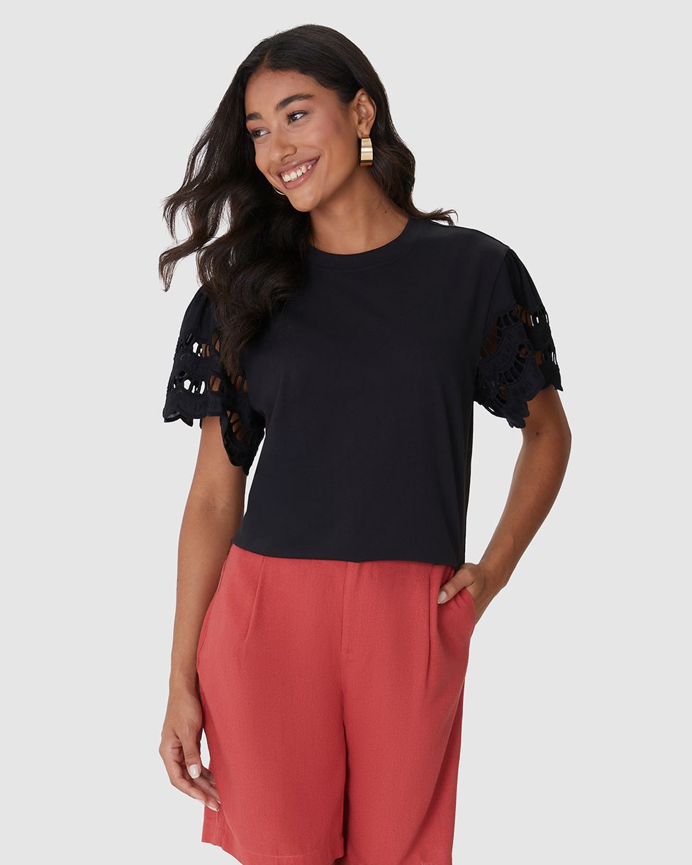 Blusa Ampla Feminina Manga Detalhe Vazado Em Algodão