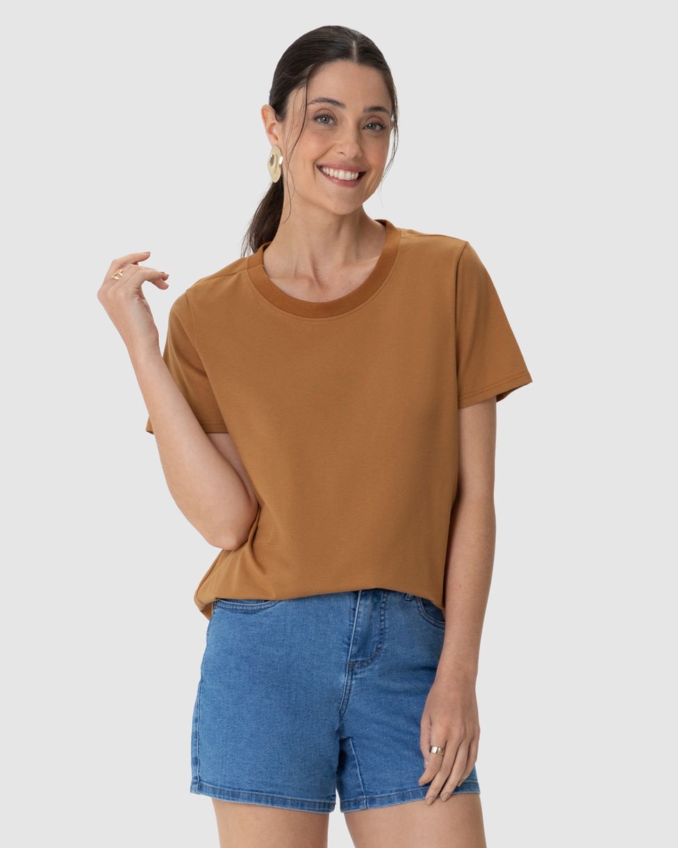 Blusa Básica Feminina Decote Redondo Com Pesponto Em Algodão