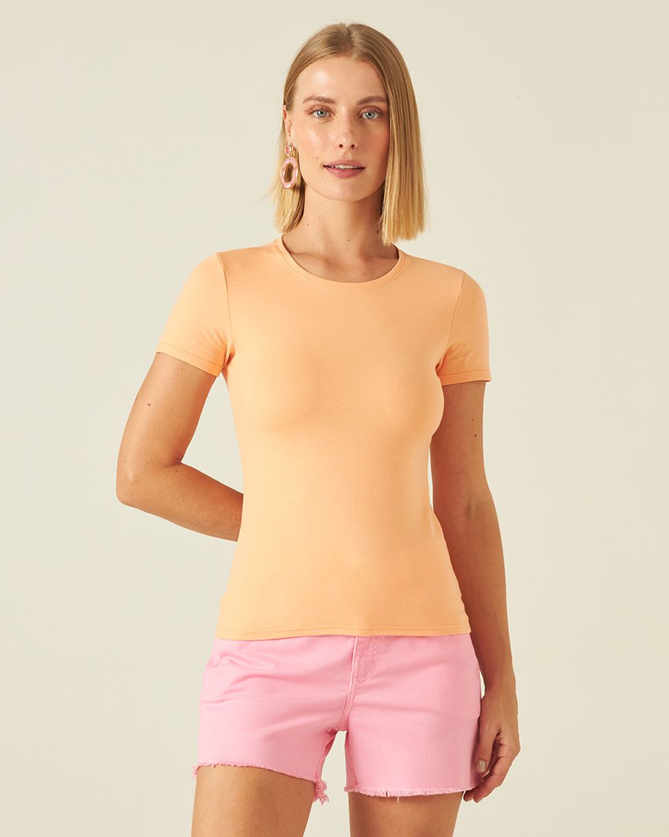 Blusa feminina feita em malha de algodão. A blusa Baby Look é uma peça essencial no guarda-roupa feminino, pois ela pode compor diversos looks! Essa peça com caimento ajustado ao corpo, conta com decote redondo e mangas curtas. Além disso, ela foi feita em malha de algodão super elástica e leve, sendo confortável, respirável de toque macio e fácil manuseio, garantindo alta durabilidade e versatilidade no uso. É uma peça atemporal e que pode ser usada de infinitas formas. Combine com calça mom jeans e tênis baixa, para um visual casual!