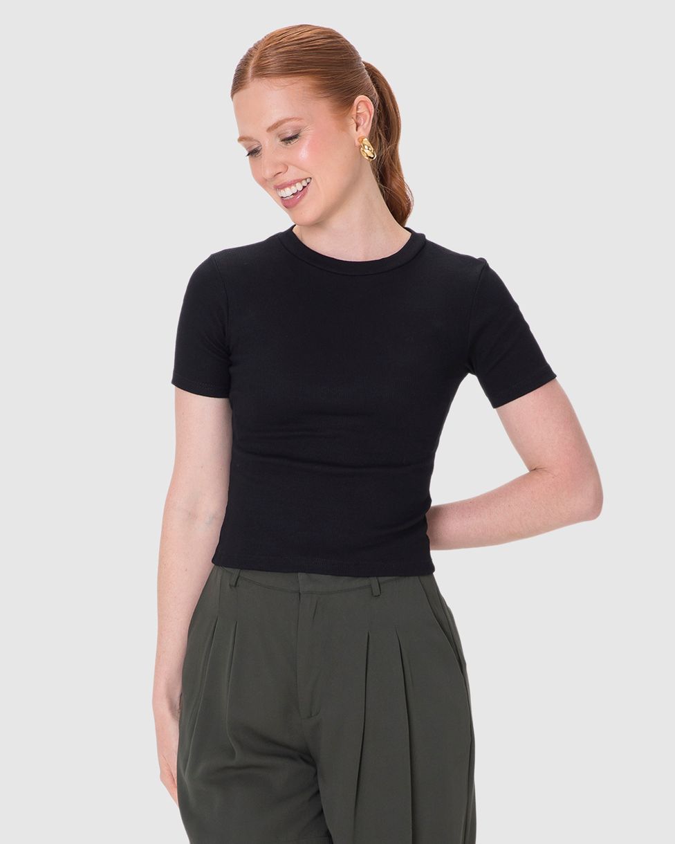 Blusa feminina feita em ribana conforto. Apresentando modelagem Long Cropped mais longa que a cropped, ficando na linha da cintura, esse modelo clássico e básico conta com decote redondo e mangas curtas. Com a fibra de algodão em sua composição, a malha ribana é um tecido em textura canelada, possuindo ótima elasticidade e caimento corporal.