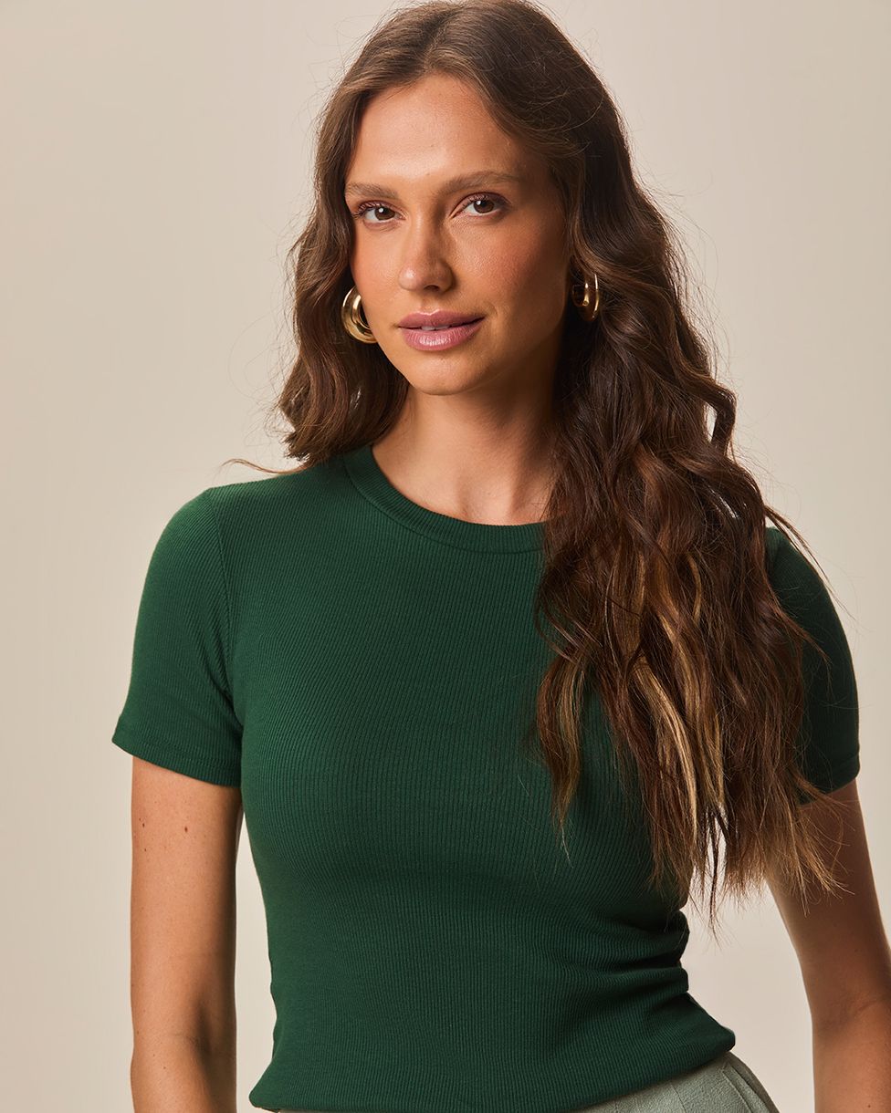 Blusa feminina feita em ribana conforto. Apresentando modelagem Long Cropped mais longa que a cropped, ficando na linha da cintura, esse modelo clássico e básico conta com decote redondo e mangas curtas. Com a fibra de algodão em sua composição, a malha ribana é um tecido em textura canelada, possuindo ótima elasticidade e caimento corporal.