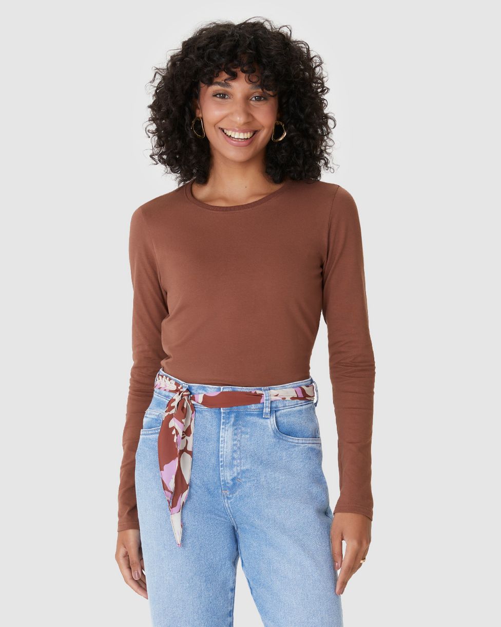 Blusa Básica Feminina Decote Redondo Manga Longa Em Algodão