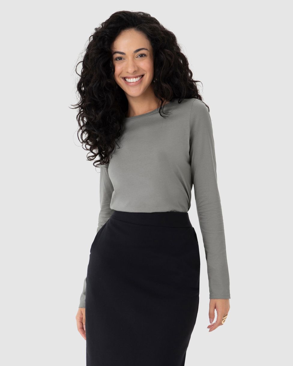 Blusa Básica Feminina Decote Redondo Manga Longa Em Algodão