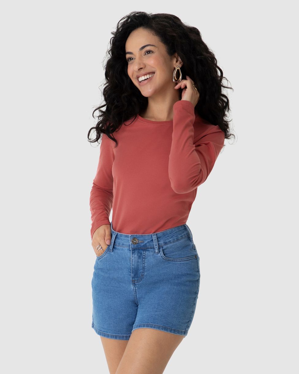 Blusa Básica Feminina Decote Redondo Manga Longa Em Algodão