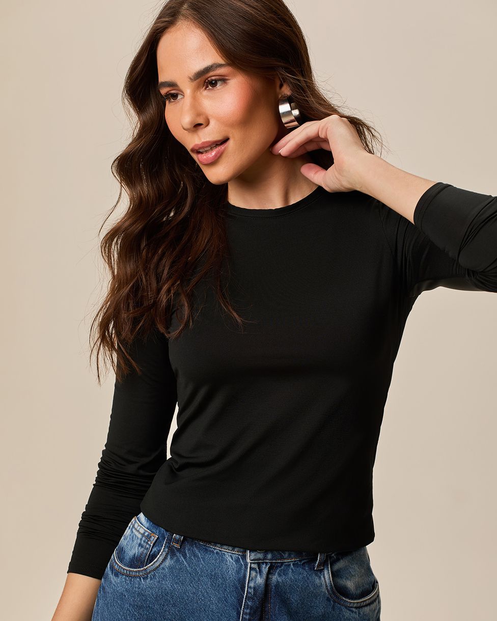 Blusa Básica Feminina Decote Redondo Manga Longa Em Malha Térmica Preto - P