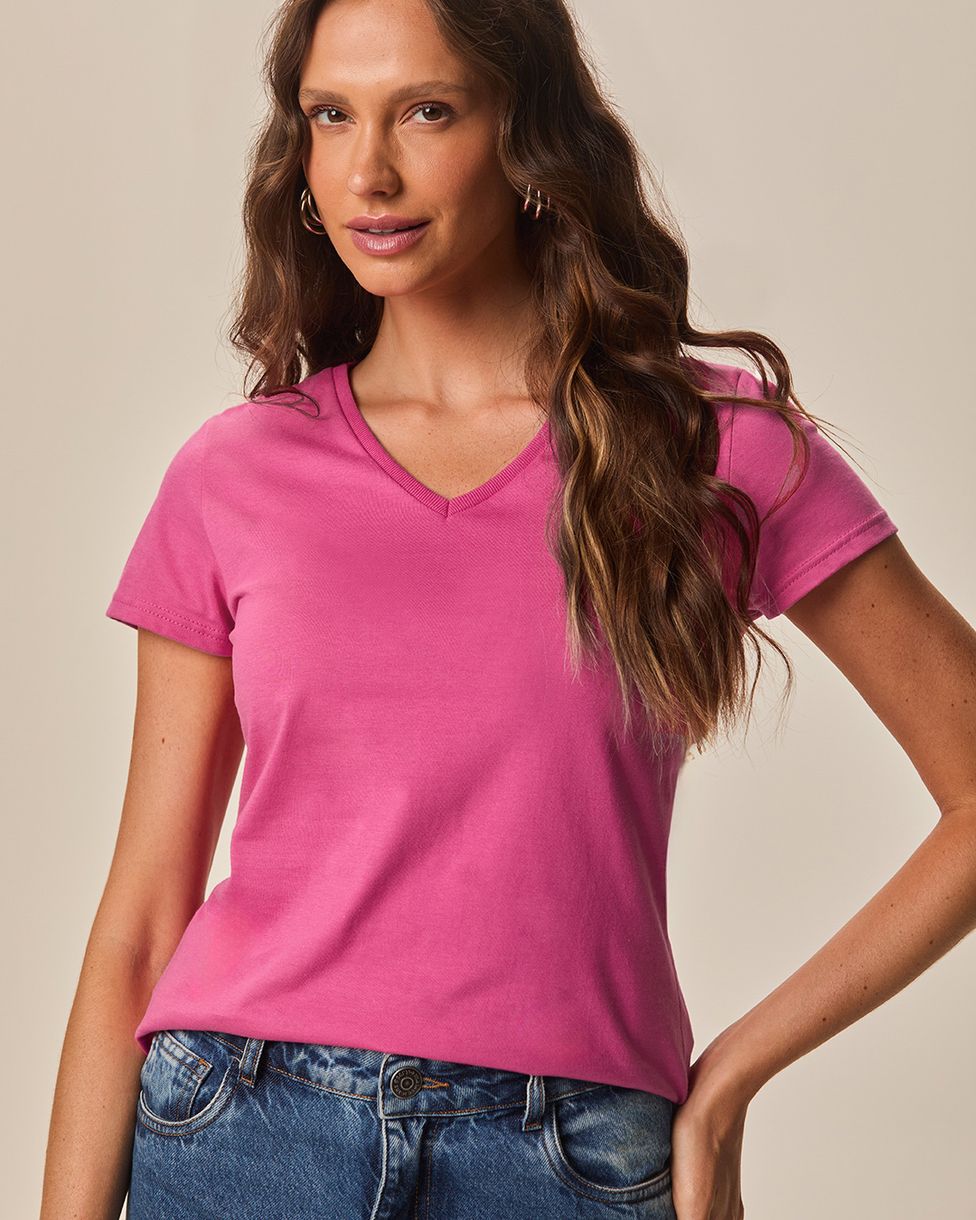 Blusa feminina feita em tecido de algodão 100%. A blusa Baby Look é uma peça essencial no guarda-roupa feminino, pois ela pode compor diversos looks! Essa peça em decote V, mangas curtas e modelagem levemente solta ao corpo, também foi feita em malha de algodão 100%, super confortável, respirável com toque macio e fácil manuseio, garantindo alta durabilidade e versatilidade no uso. É uma peça ideal para usar com peças de sarja em cores complementares e sobreposição em jeans!