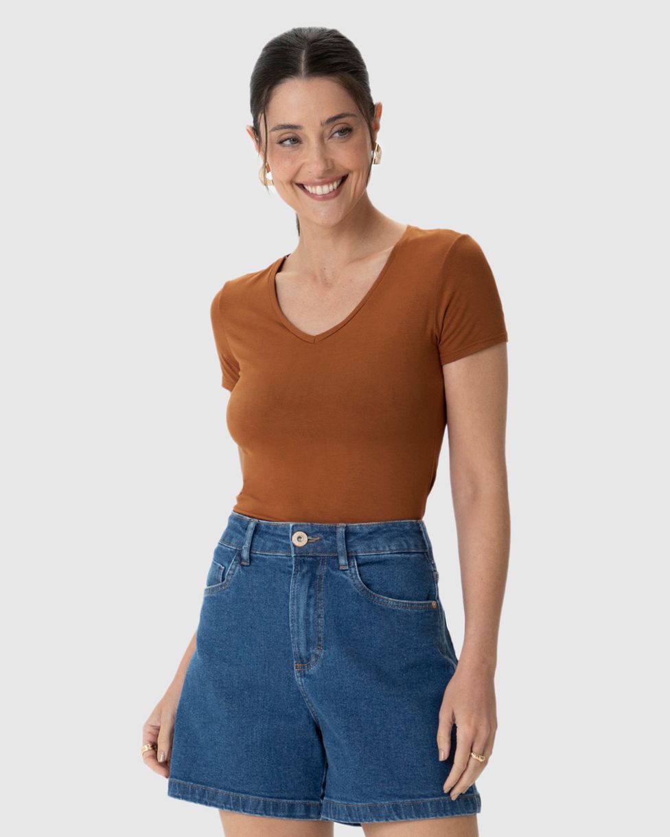 Blusa Básica Feminina Decote V Em Viscose Stretch