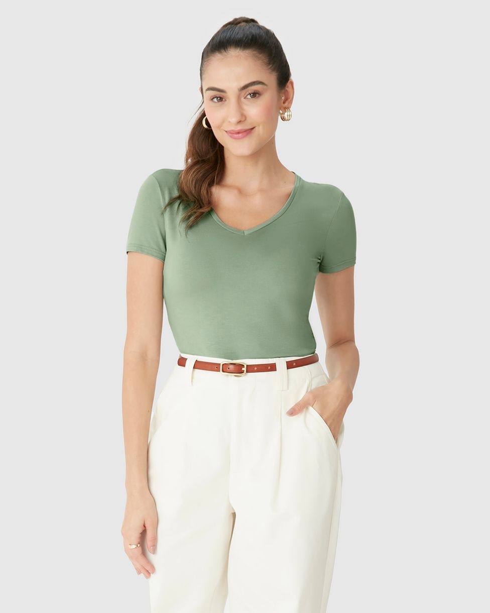 Blusa Básica Feminina Decote V Em Viscose Stretch Verde - G
