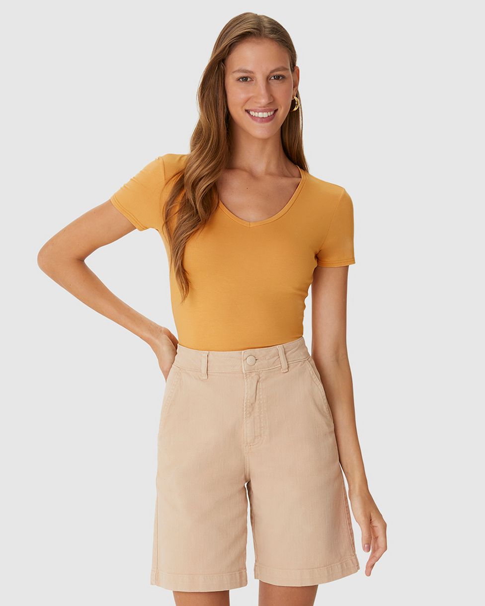 Blusa feminina feita em tecido de viscose stretch conforto. A blusa Baby Look é uma peça essencial no guarda-roupa feminino, pois ela pode compor diversos looks! Apresentando decote V e mangas curtas, ela foi feita em malha com stretch que possui viscose proveniente de reflorestamento em sua composição, ermitindo conforto e frescor. É uma malha queridinha por aqui e sempre está presente nas nossas coleções. Complete o look com shorts de sarja colorida Malwee e sandália de fibras naturais e curta os dias de calor!