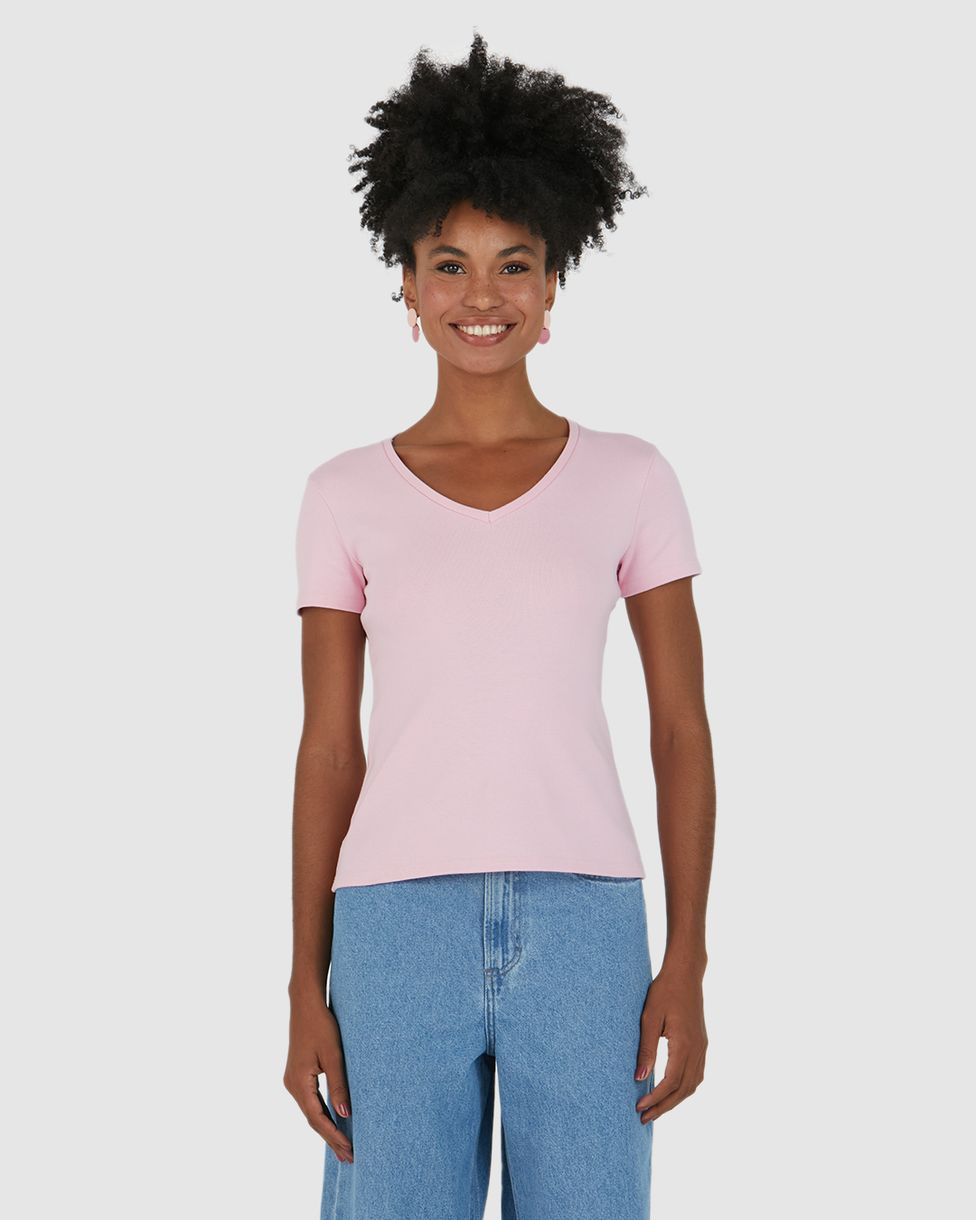 Blusa feminina feita em meia malha de algodão. A blusa básica é uma peça essencial no guarda-roupa feminino, pois ela pode compor diversos looks! Essa peça em decote V, mangas curtas e modelagem levemente ajustada ao corpo, também foi feita em meia malha de algodão, sendo um tecido leve e fresco, moldando-se perfeitamente ao corpo com bom caimento e maior durabilidade. É uma peça ideal para usar com mom jeans da Malwee e tênis baixo, para um visual casual!