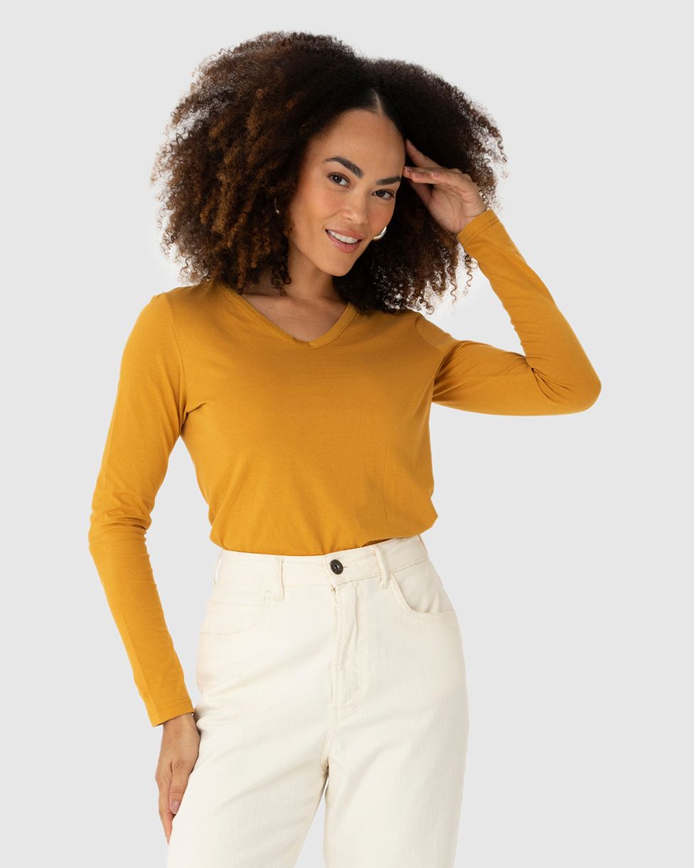 Blusa Básica Feminina Decote V Manga Longa Em Algodão