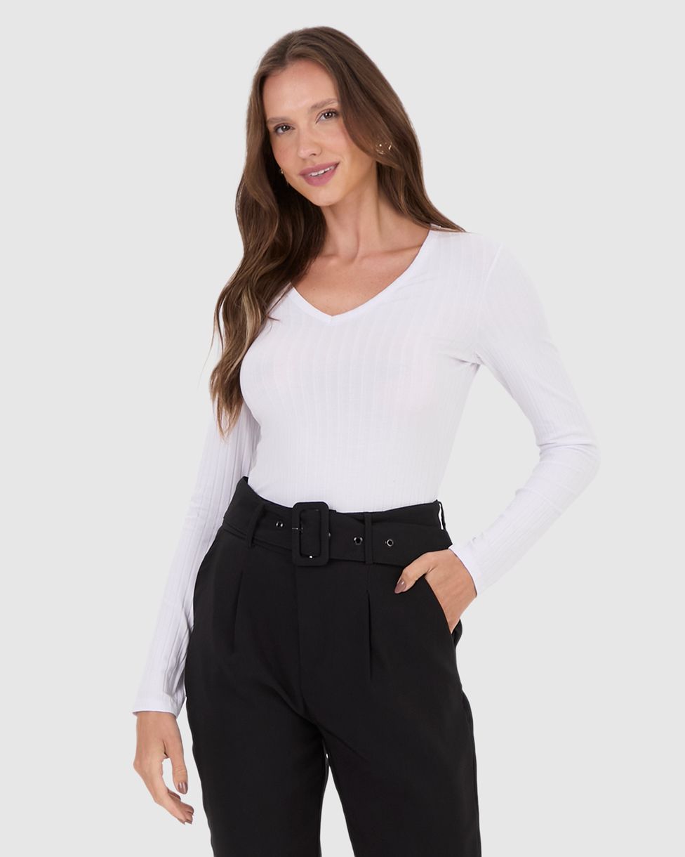 Blusa Básica Feminina Decote V Manga Longa Em Malha Canelada De Viscose