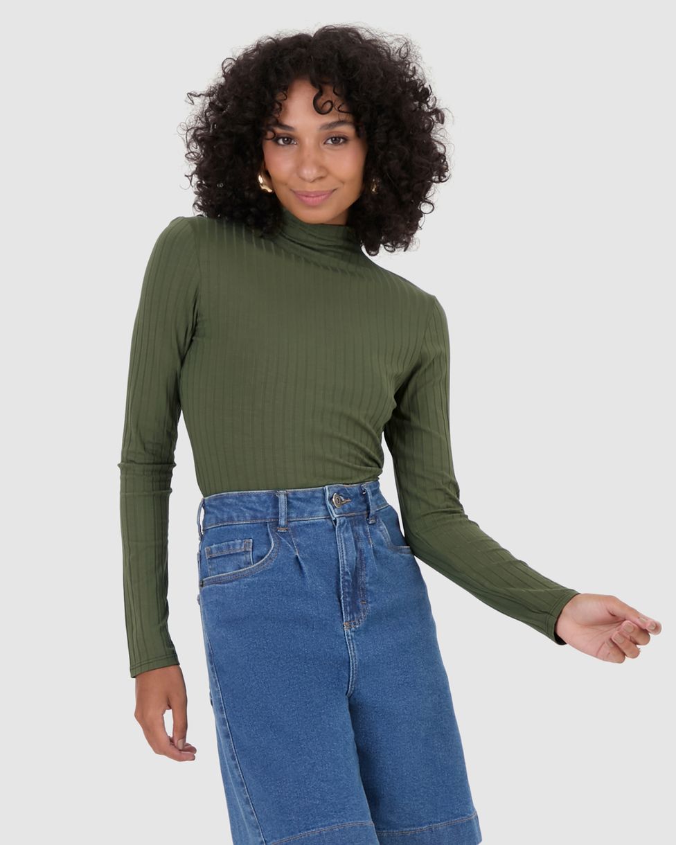 Blusa Básica Feminina Gola Alta Em Malha Canelada De Viscose
