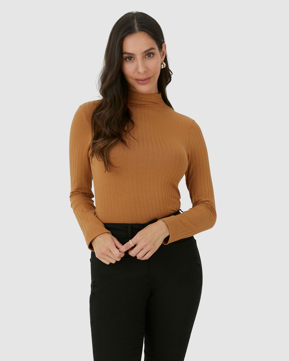 Blusa Básica Feminina Gola Alta Em Malha Canelada De Viscose