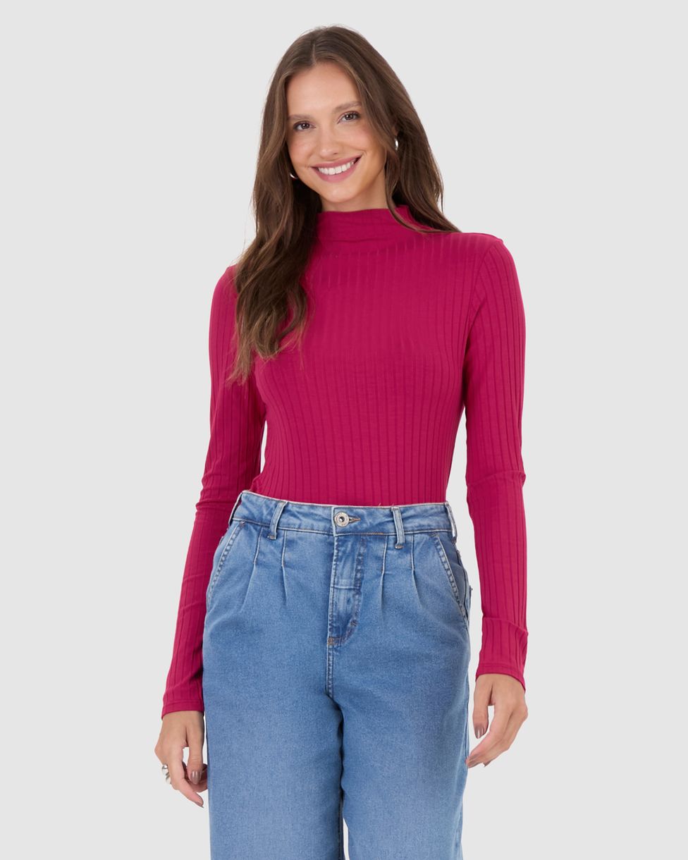 FemininoBlusas e CamisetasBlusas BásicasBlusa Básica Feminina Gola Alta Em Malha Canelada De Viscose