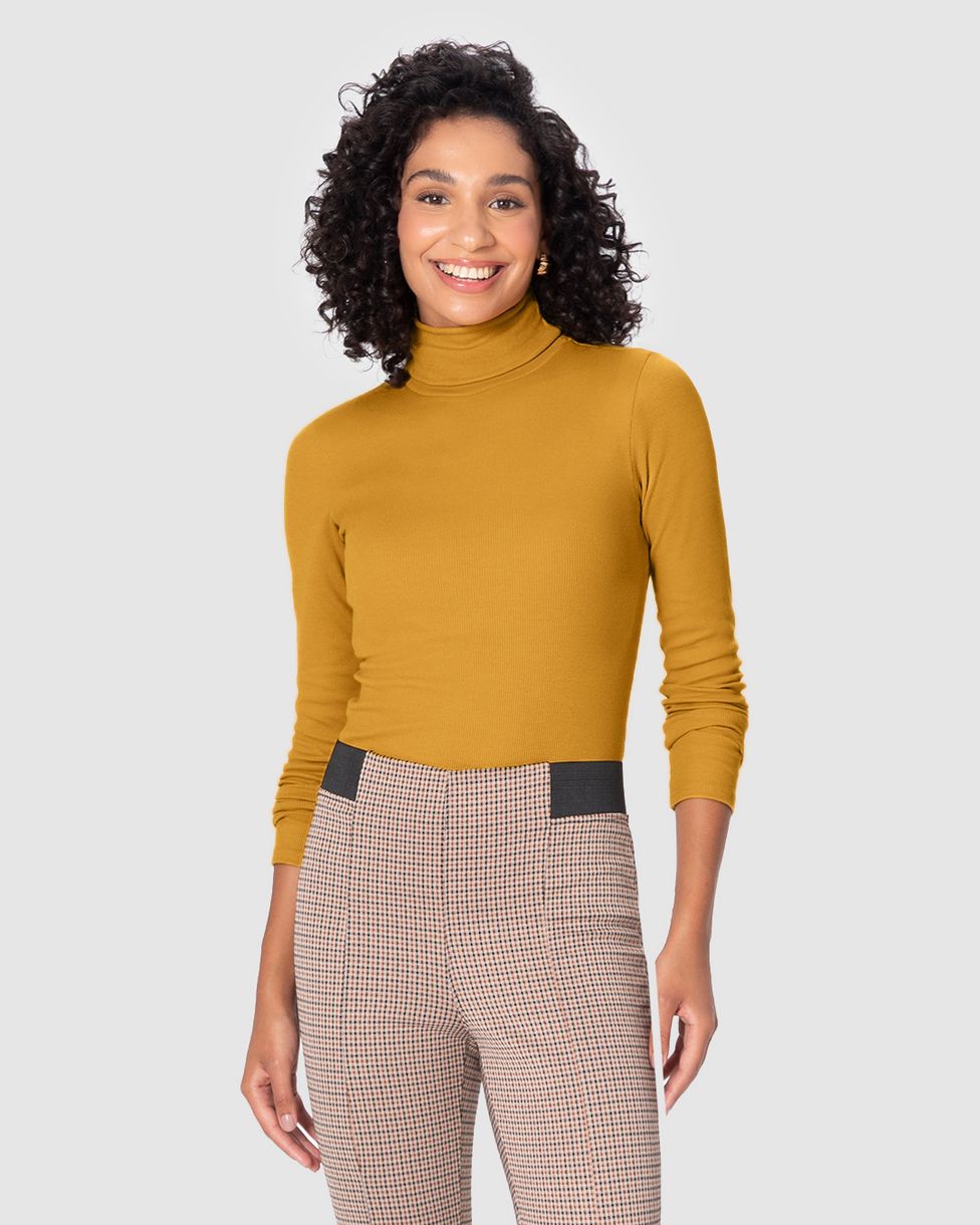 Blusa Básica Feminina Gola Alta Manga Longa Em Ribana Amarelo - XGG