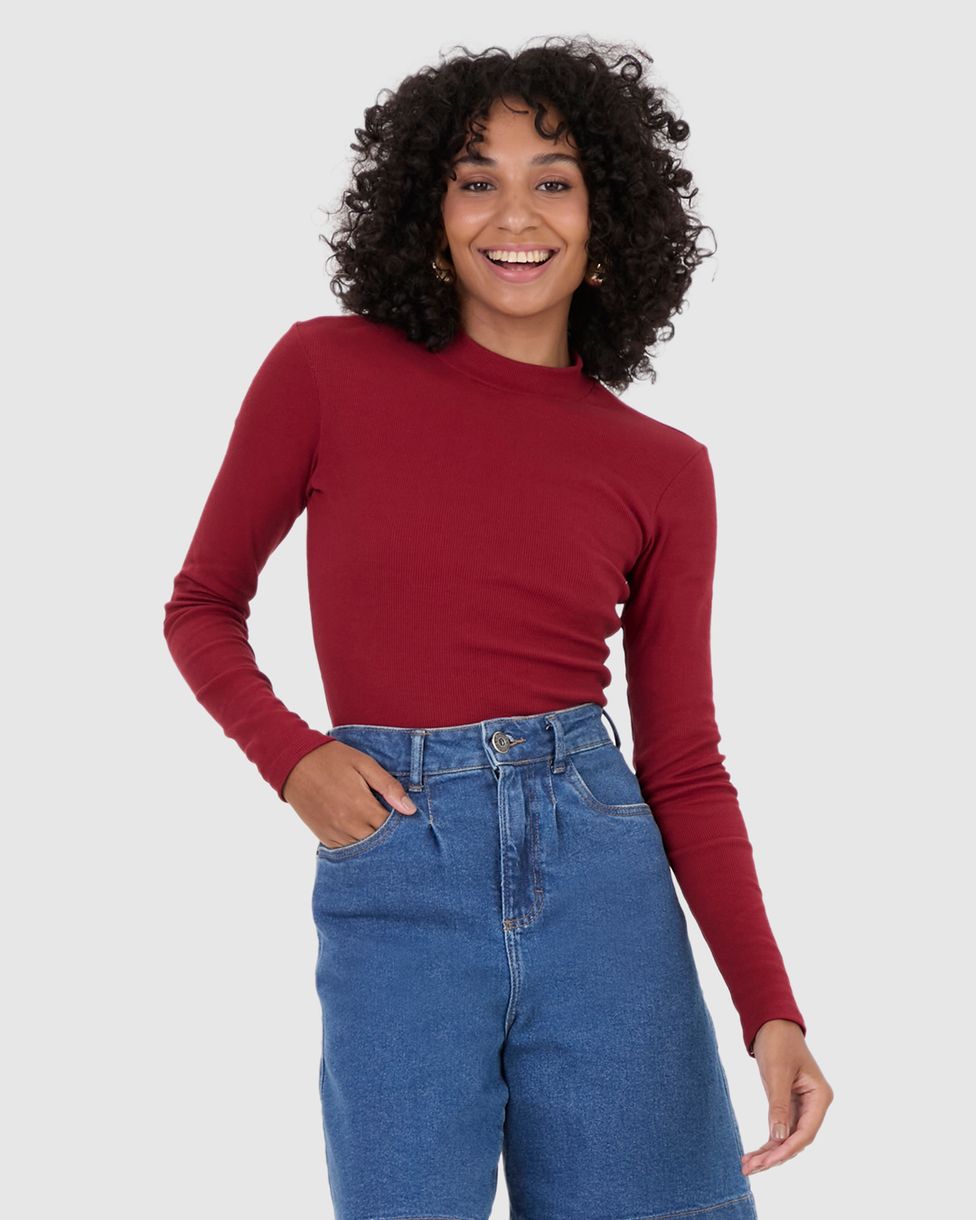 Blusa Básica Feminina Gola Alta Manga Longa Em Ribana