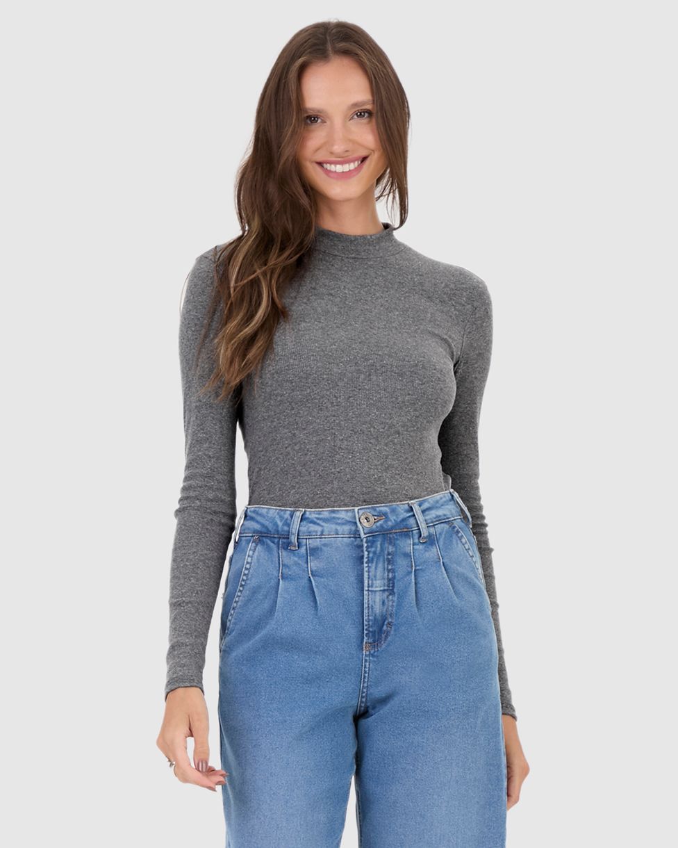 Blusa Básica Feminina Gola Alta Manga Longa Em Ribana