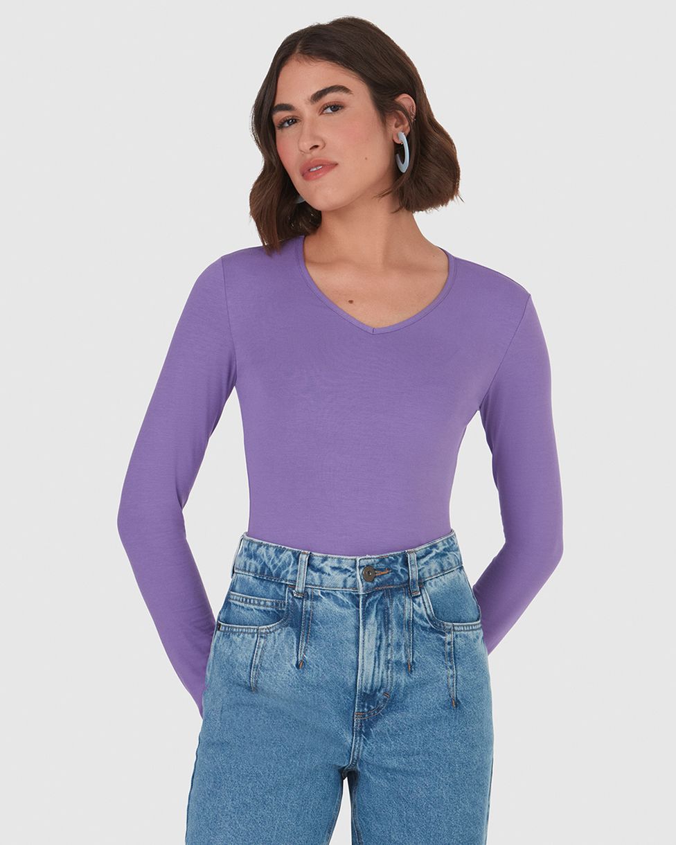Blusa Básica Feminina Gola V Manga Longa Em Viscose Stretch