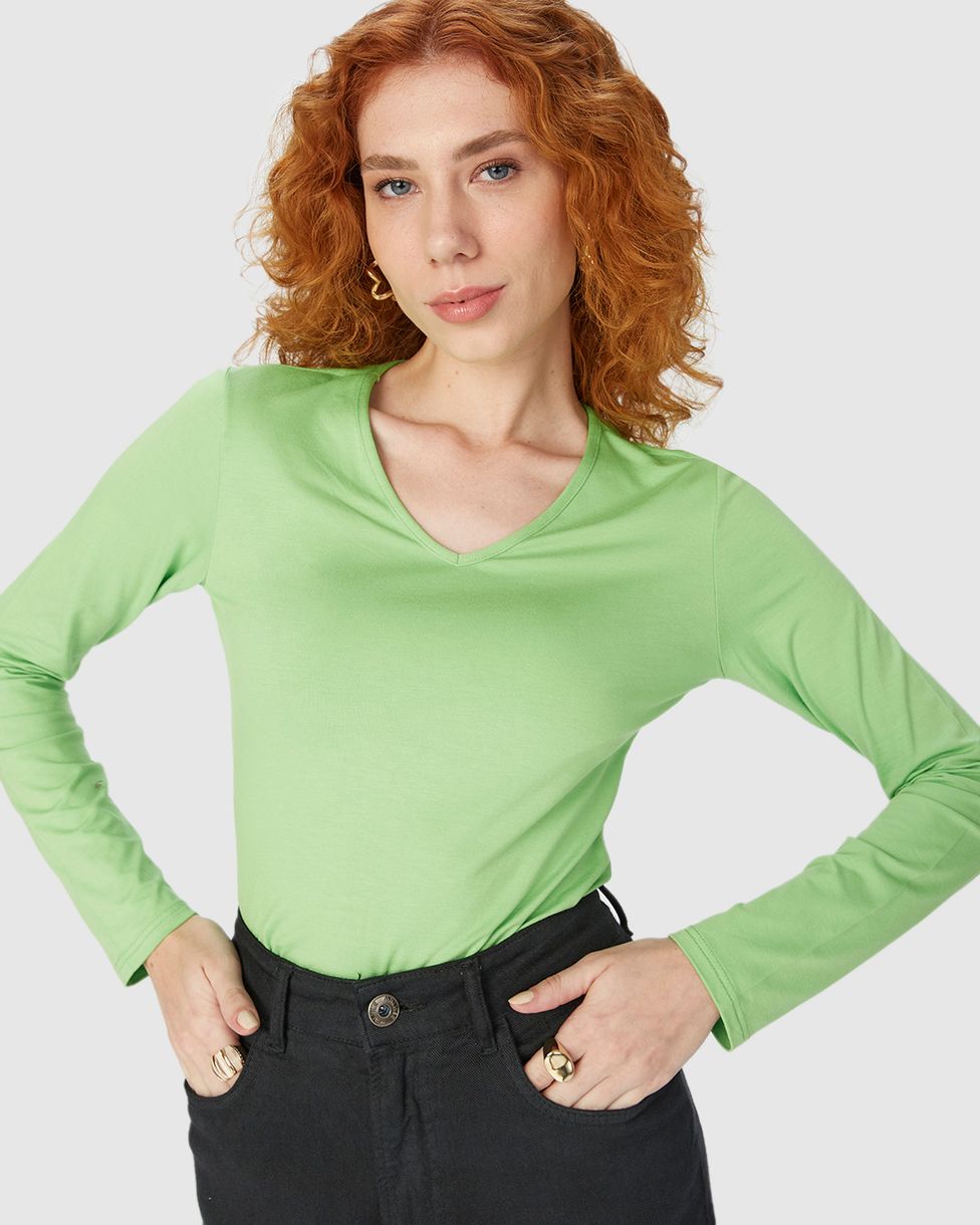 Blusa Básica Feminina Gola V Manga Longa Em Viscose Stretch