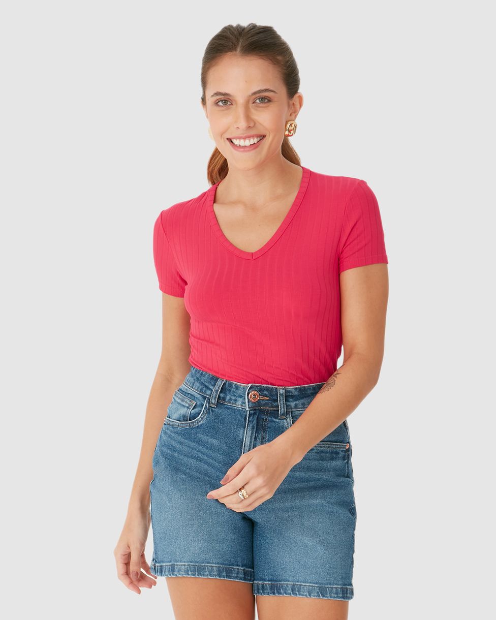 Blusa Básica Feminina Justa Decote V Em Malha Canelada De Viscose