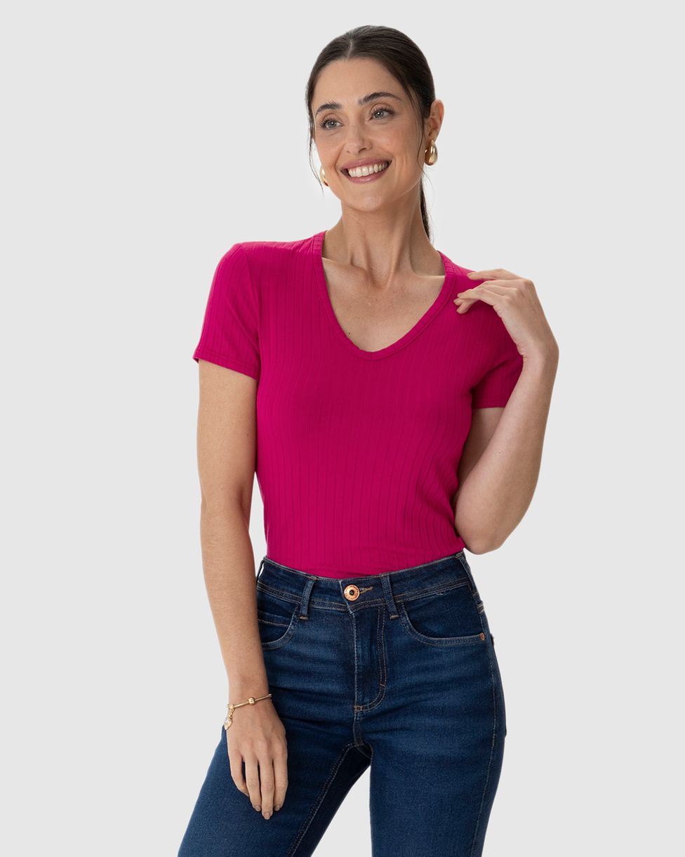 Blusa Básica Feminina Justa Decote V Em Malha Canelada De Viscose