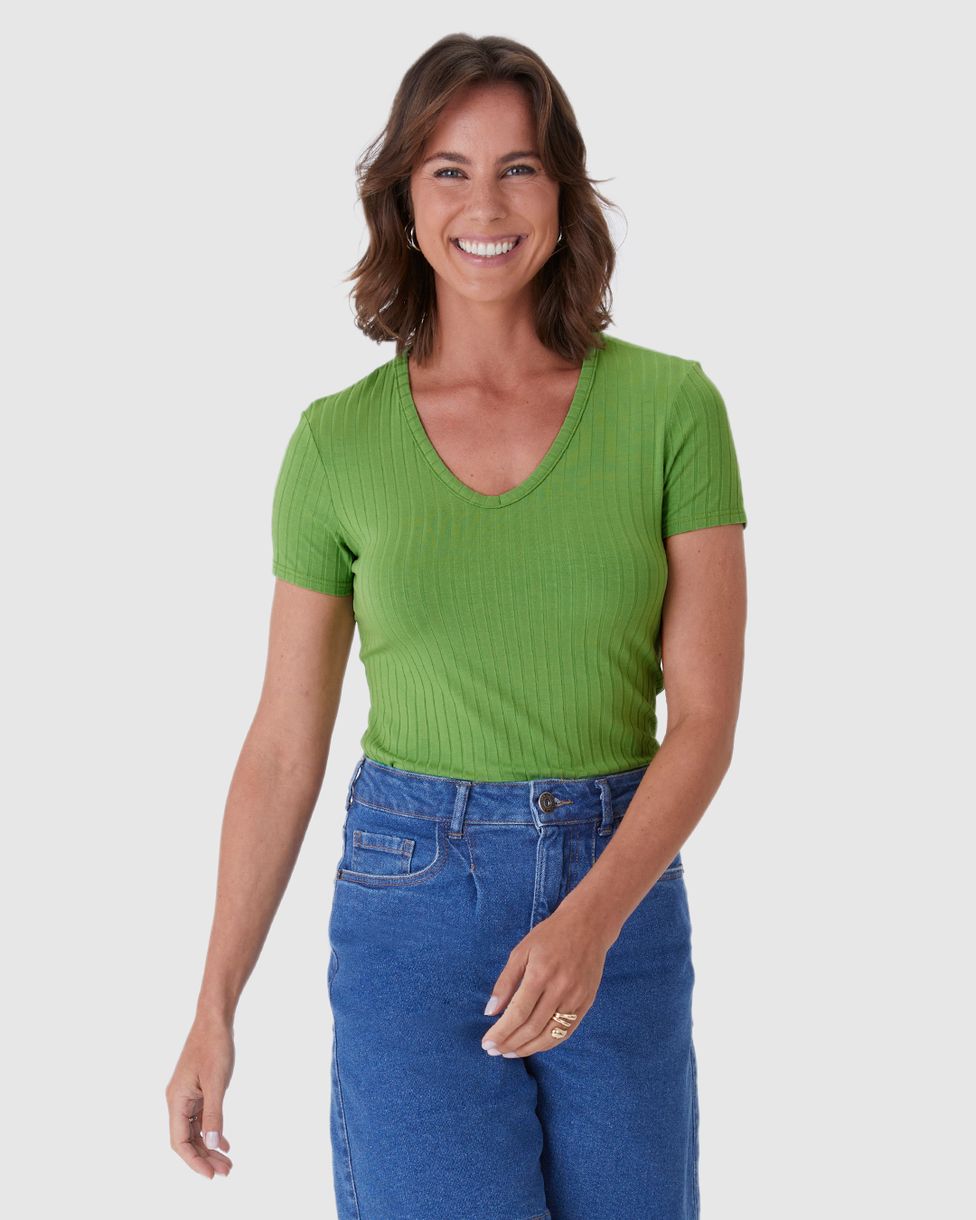 Blusa Básica Feminina Justa Decote V Em Malha Canelada De Viscose