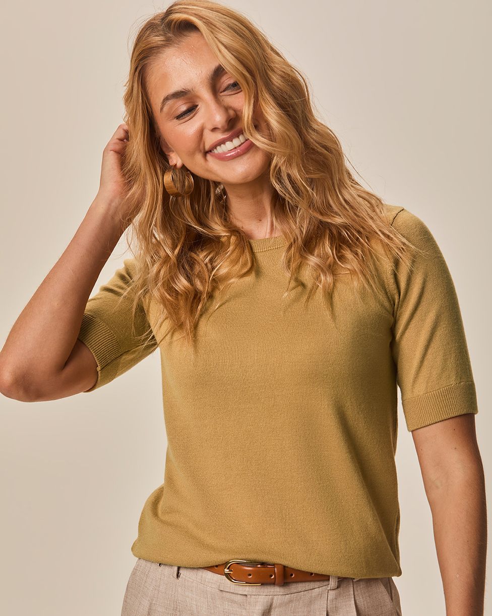 Blusa Básica Feminina Manga Curta Com Barra E Mangas Caneladas Em Tricô