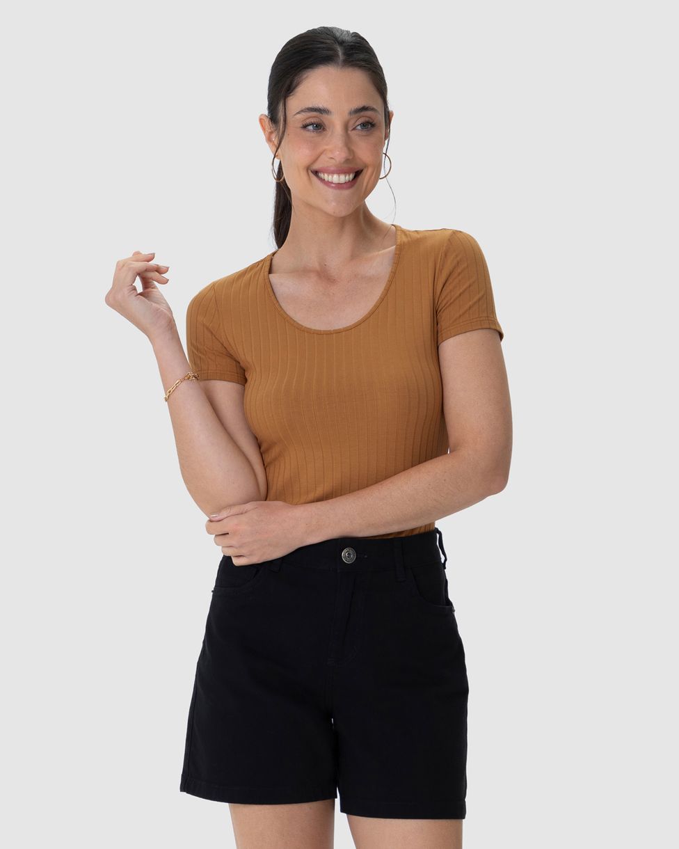 Blusa Básica Feminina Manga Curta Em Canelado De Viscose