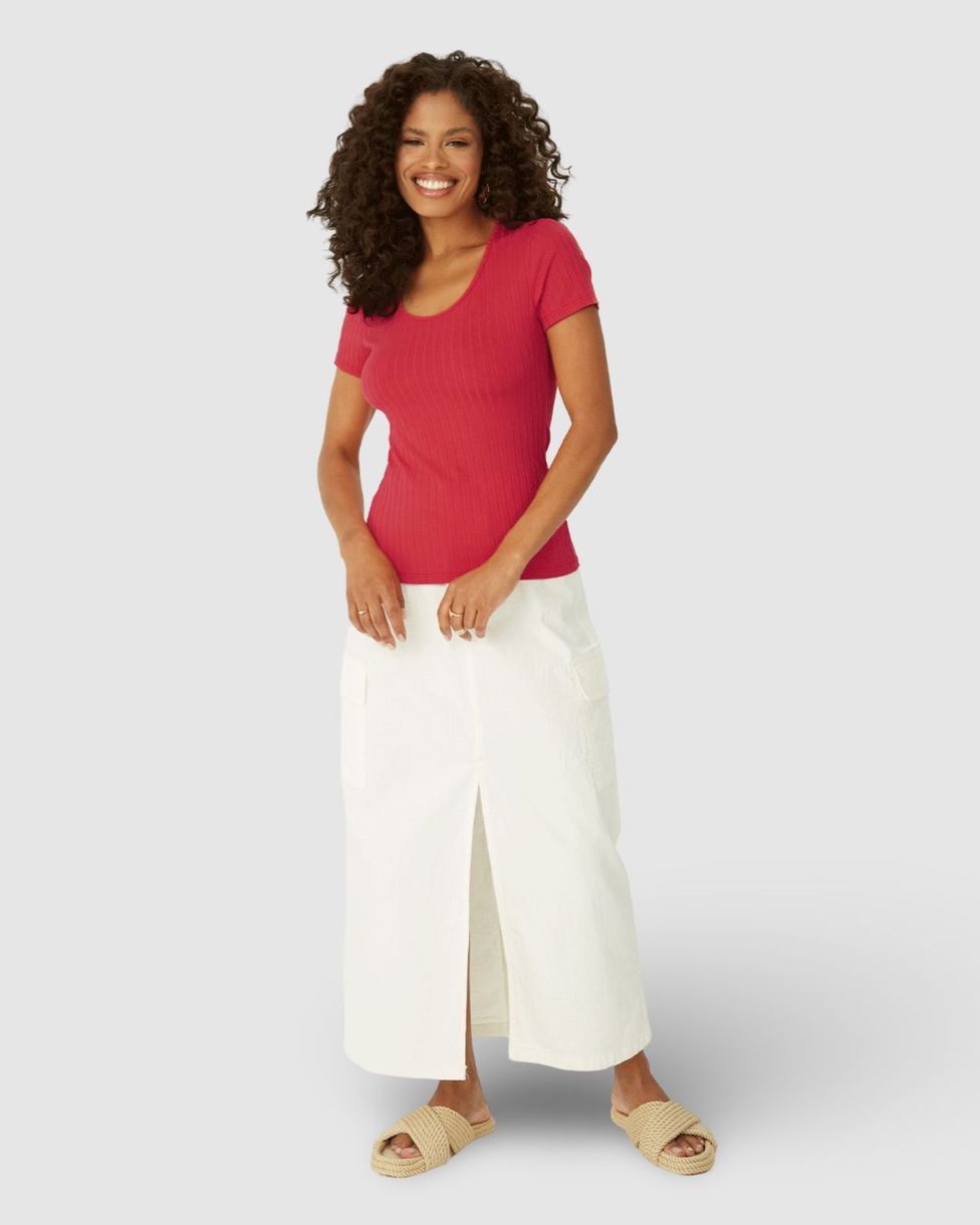 Blusa feminina feita em tecido canelado de viscose. Apresentando uma blusa com caimento mais ajustado ao corpo, é a peça perfeita para todas as ocasiões. Também apresentando decote redondo e mangas curtas, ela foi feita em malha canelada texturizada que permite frescor e conforto. Sendo uma peça atemporal e versátil, que pode ser usada tanto em combinações casuais com jeans e tênis até mais arrumadas com calça de alfaiataria e salto bloco!