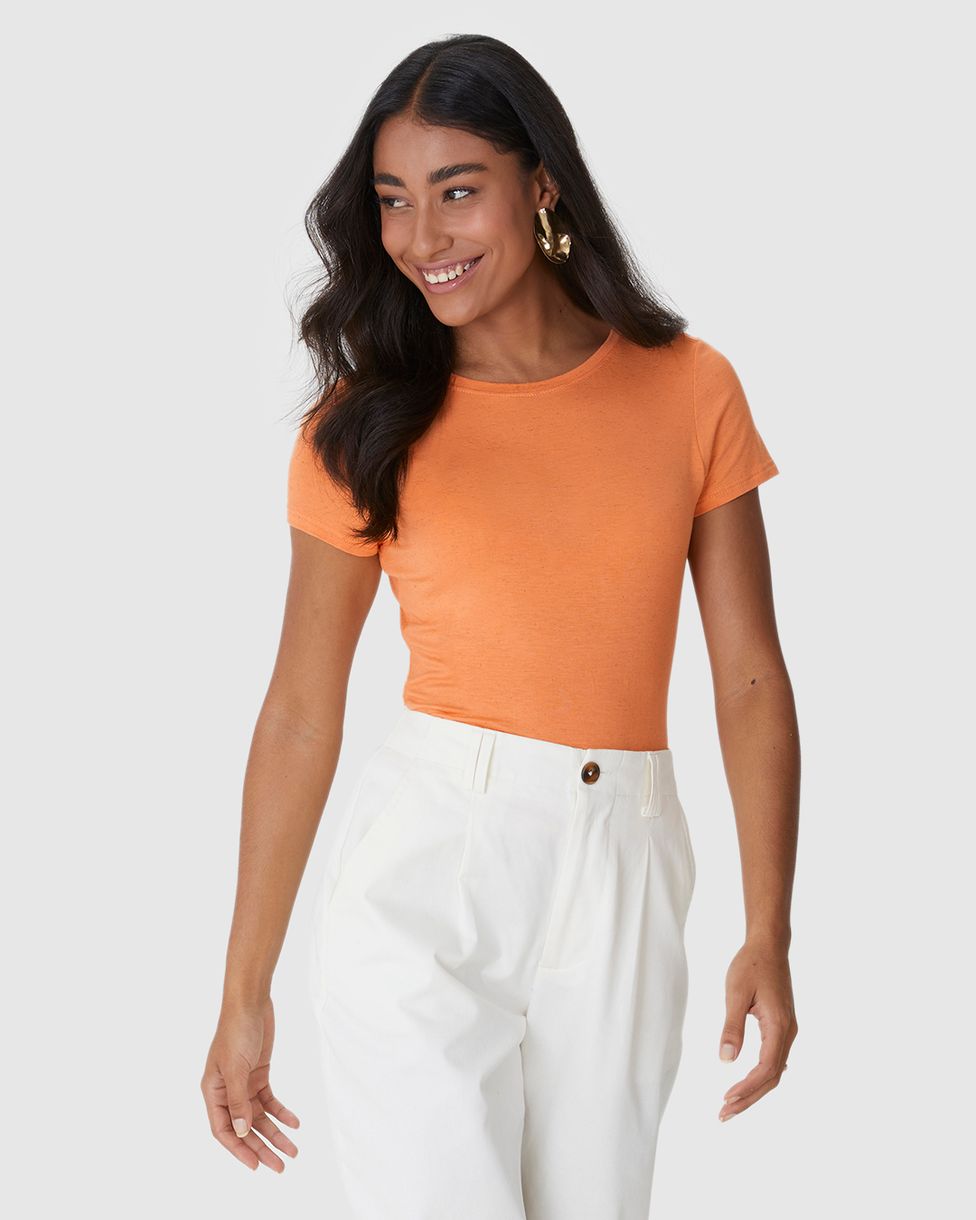 • Decote redondo e manga curta: estilo casual e conforto para os dias mais quentes