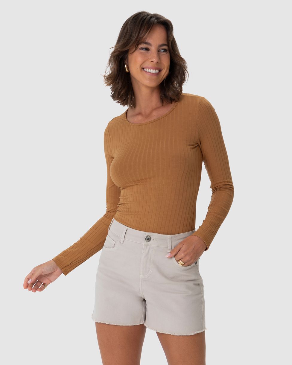 Blusa Básica Feminina Manga Longa Em Malha Canelada De Viscose