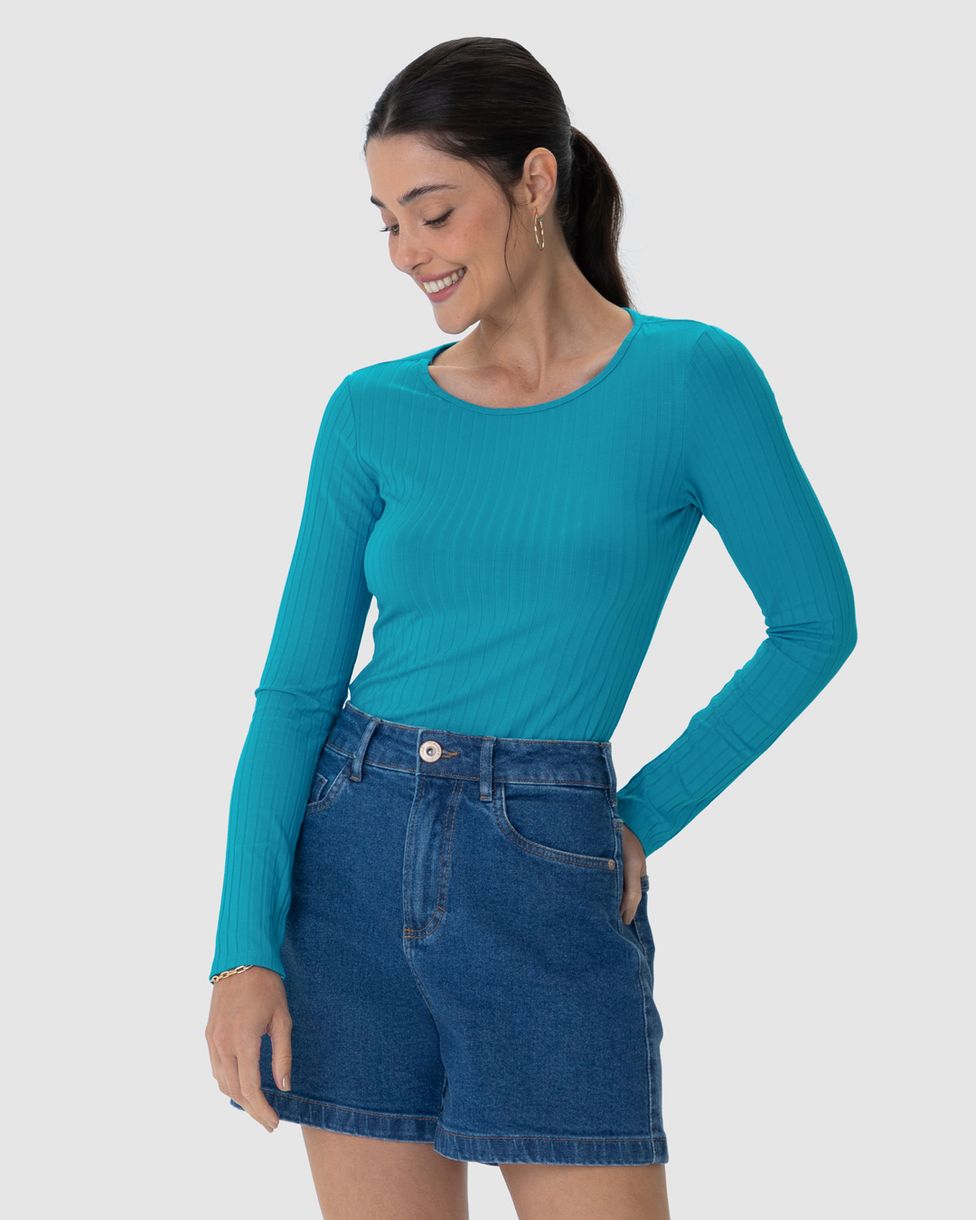 Blusa Básica Feminina Manga Longa Em Malha Canelada De Viscose