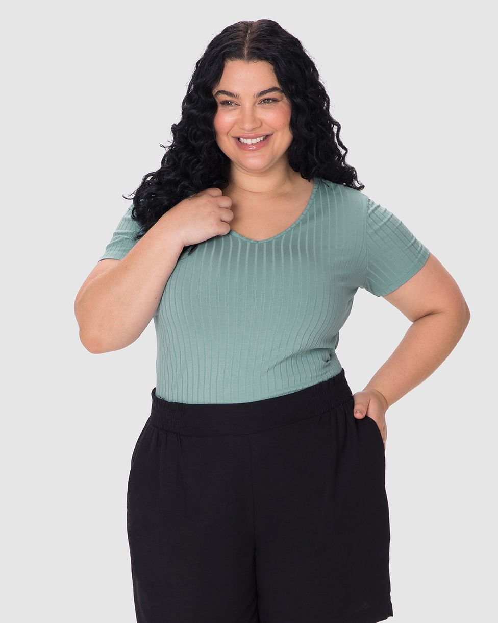 Blusa Básica Feminina Plus Size Decote V Em Canelado De Viscose