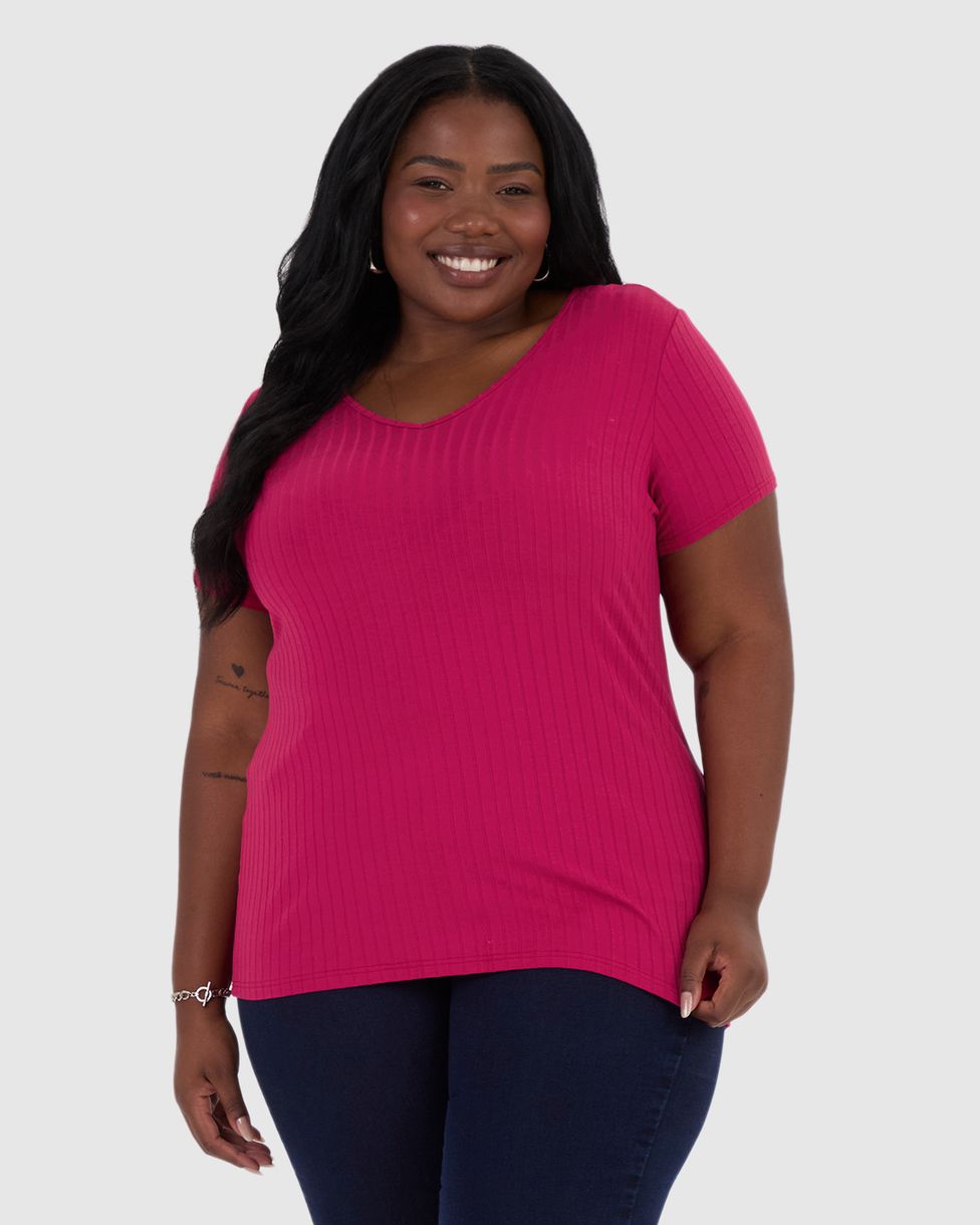 Blusa Básica Feminina Plus Size Decote V Em Canelado De Viscose